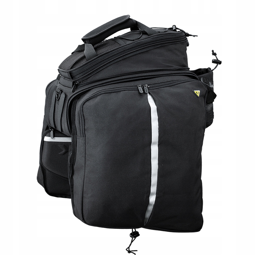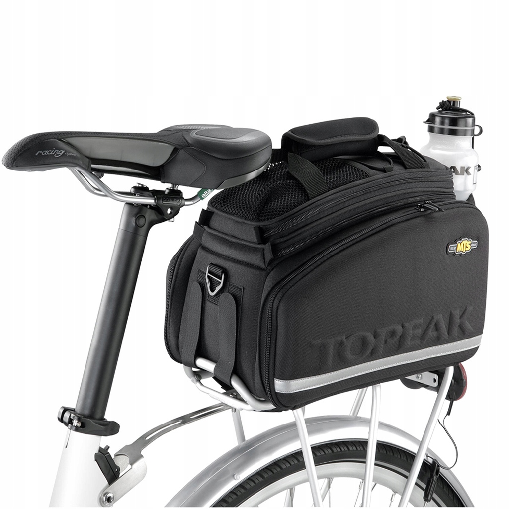 Найбільша сумка від Topeak b>. Величезний багажний простір із верхньою частиною, що розширюється, бічними кошиками та тримачем для пляшки з водою, кріпиться до будь-якого багажника за допомогою липучок. Формовані бічні панелі в поєднанні з Еластична тканина щільністю 600 день створює напівжорстку стійку до атмосферних умов сумку для багажу. Розділене основне відділення та бічні панелі розширюються, щоб забезпечити додаткову місткість. Задній тримач пляшки з водою дозволяє носити більше води під час тривалих подорожей. Кріпиться за допомогою інтегрованих ременів на липучці. Для використання бічних сумок потрібна стійка з прикріпленими бічними рамами або традиційна стійка, щоб запобігти контакту сумок із заднім колесом.