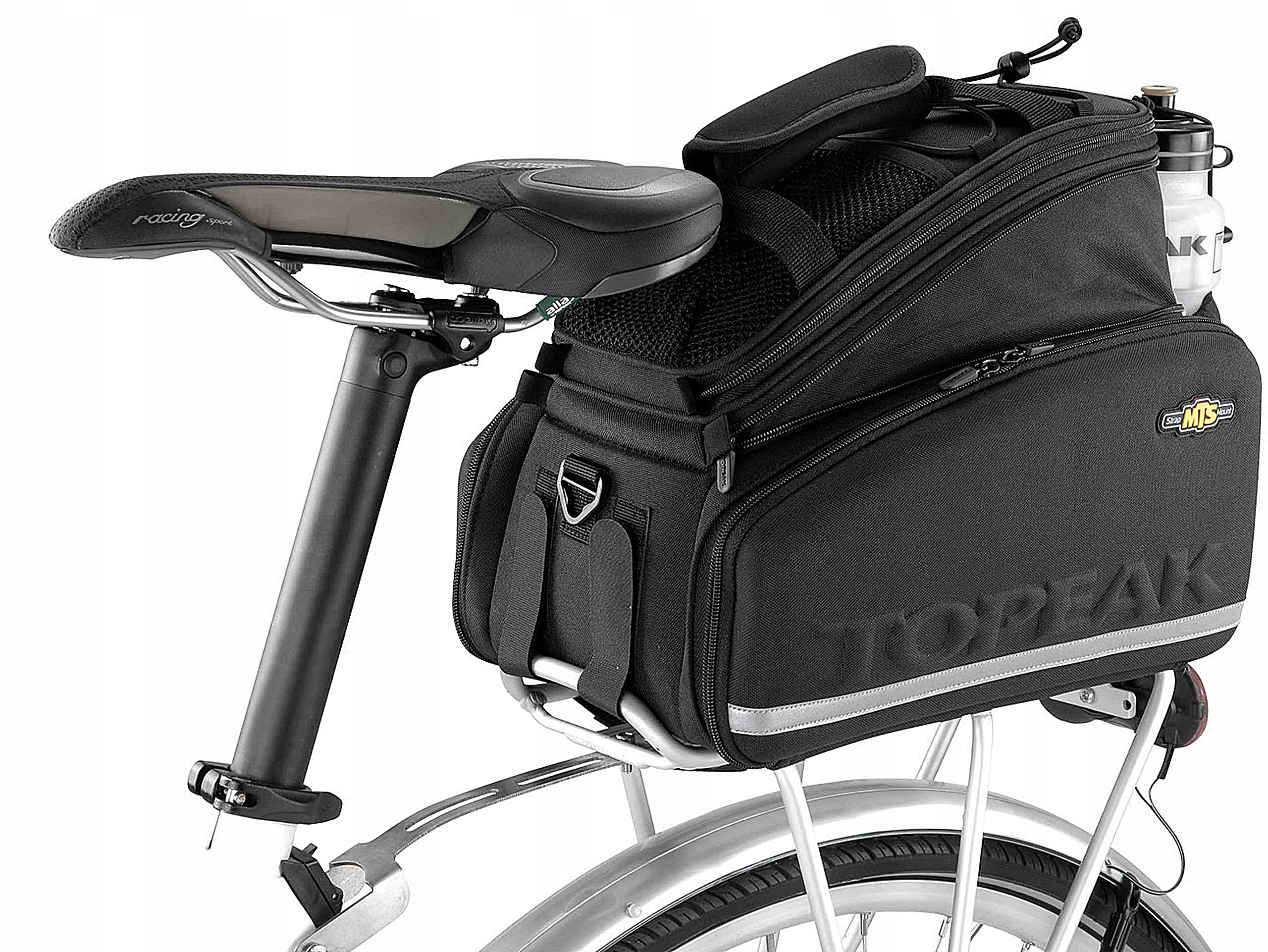 Величезний багажний простір із збільшеною верхньою частиною, бічними багажниками та тримачем для пляшок, які кріпляться до будь-якого багажника за допомогою липучок. Будь ласка, не бійтеся цієї системи. На відміну від багатьох інших сумок, особливо менш якісних, ця добре закріплена сумка надійно та стабільно сидить на багажнику. Він не викривляється, його не потрібно весь час виправляти.