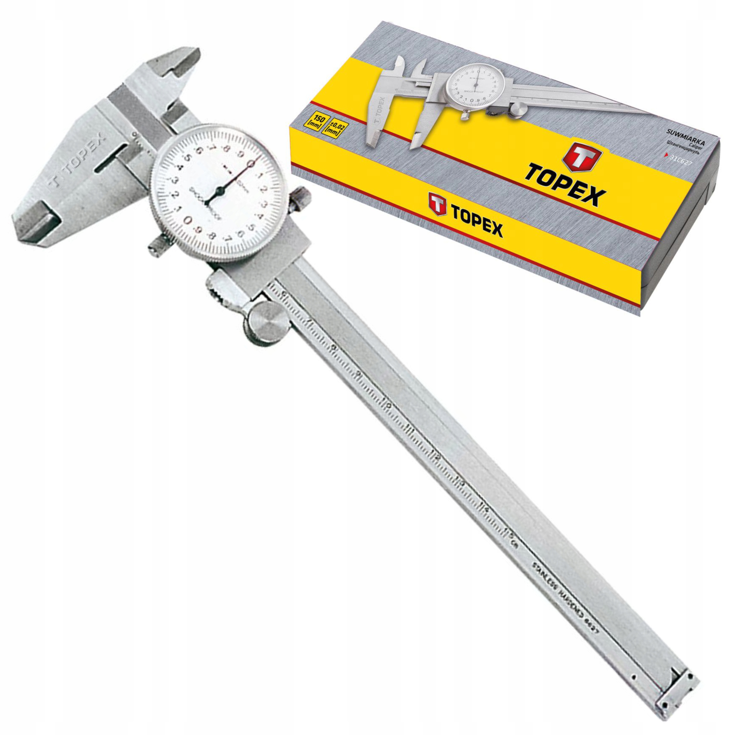 Одним із основних вимірювальних приладів є штангенциркуль TOPEX (арт. № 31C627) з аналоговим відліком з діапазоном вимірювання 150 мм і точністю вимірювання 0,02 мм. Виготовлений із високоякісної загартованої сталі. Дозволяє вимірювати внутрішні, зовнішні та глибинні вимірювання. Затискний гвинт, який фіксує повзунок, полегшує вимірювання. Бренд TOPEX орієнтований на любителів DIY.