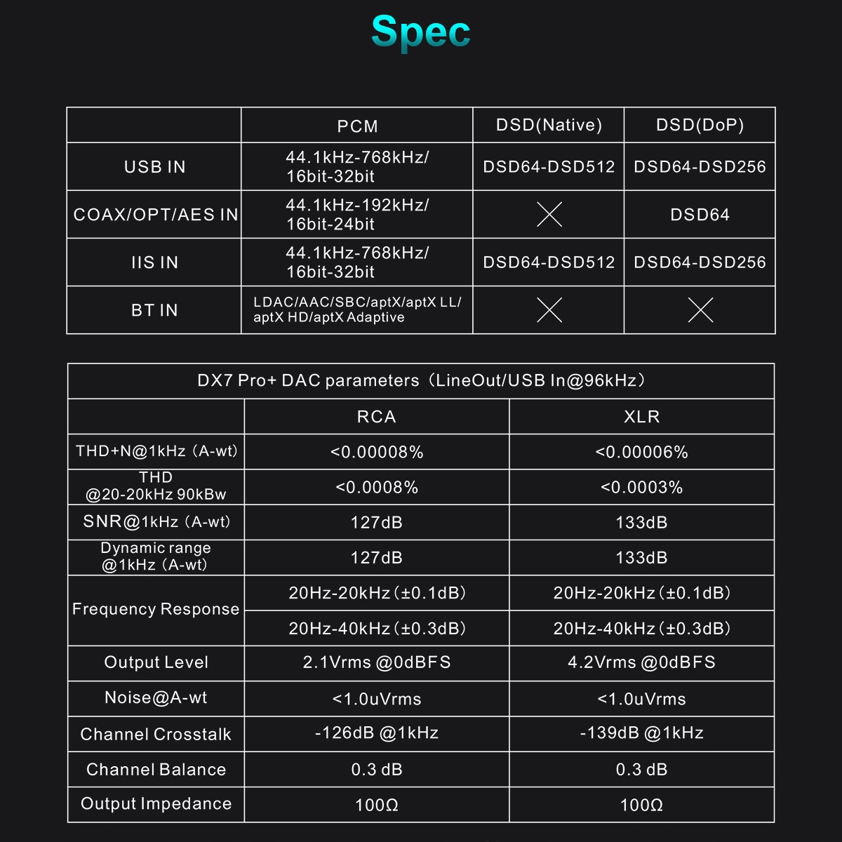 DX7 Pro+ має цифро-аналоговий перетворювач ESS Sabre ES9038Pro, який використовує 32-розрядну архітектуру HyperStream, що забезпечує високу якість звуку. Кожен канал DX7 Pro+ з’єднаний паралельно, кожен з яких використовує чотири канали мікросхеми ЦАП. Завдяки цьому він здатний відтворювати насичений і неймовірно точний звук.