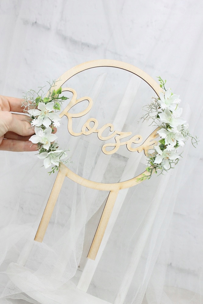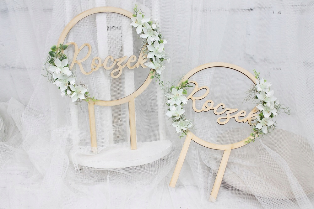 Красивий, оригінальний топер, квітковий прикраса тортів, зроблене на дерев'яному ободі з діаметром 20 см з роком напису.