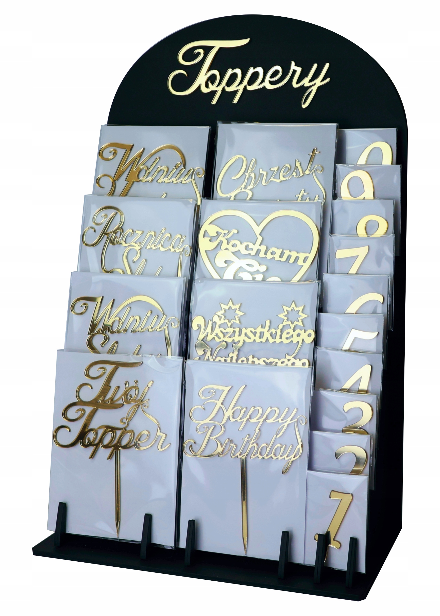 TOPPER NA TORT, STOJAK Z TOPPERAMI LUSTRO ZŁOTE 36 SZT.