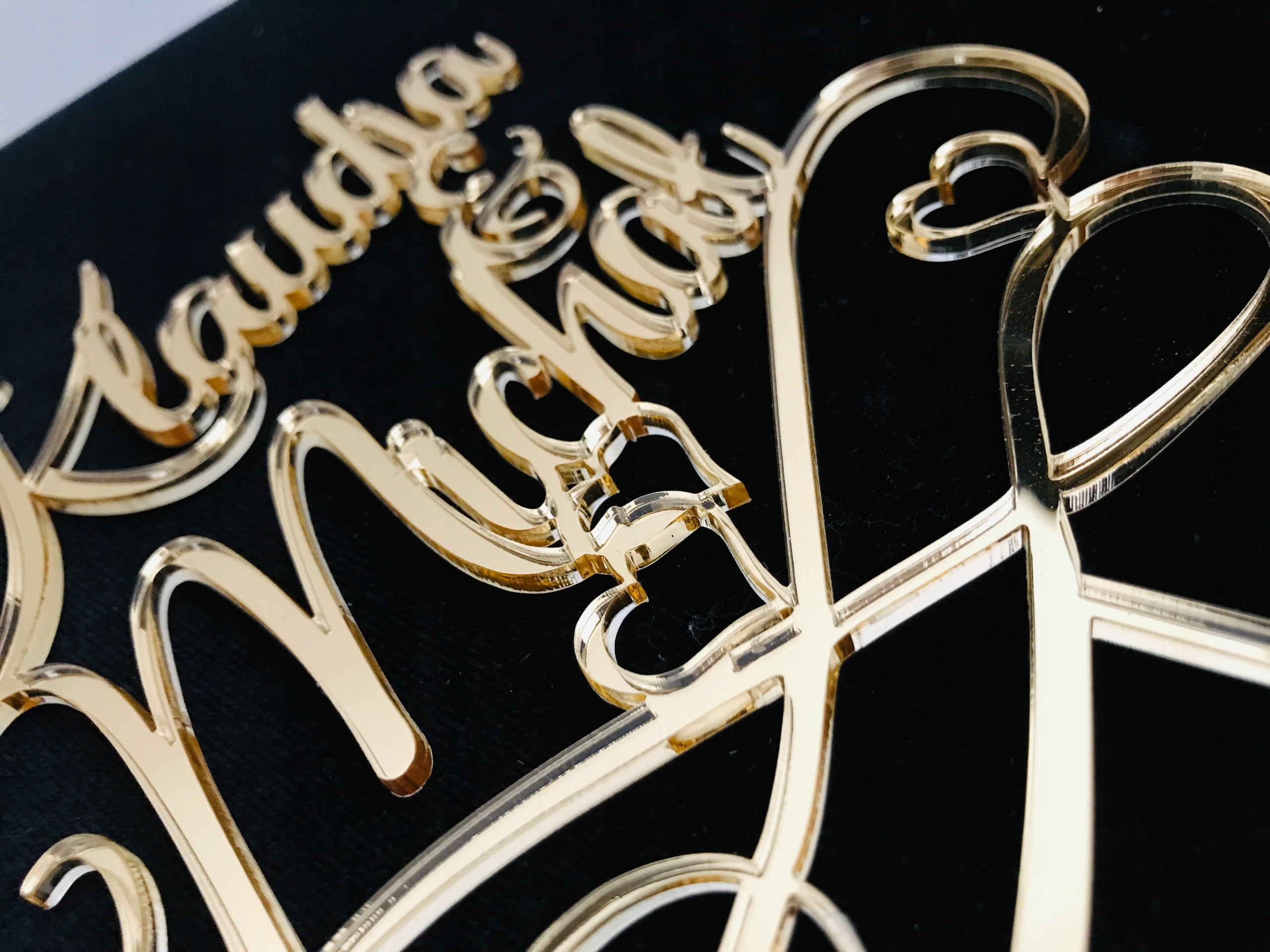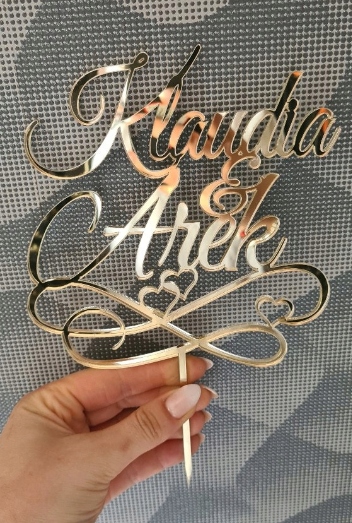 Топпер виготовлений з оргскла з товщиною близько 3 мм у кольорі золотистого дзеркалаУ повідомленні для продавця, розміщуючи замовлення, надайте імен для розміщення на топпер, наприклад Klaudia & Michał