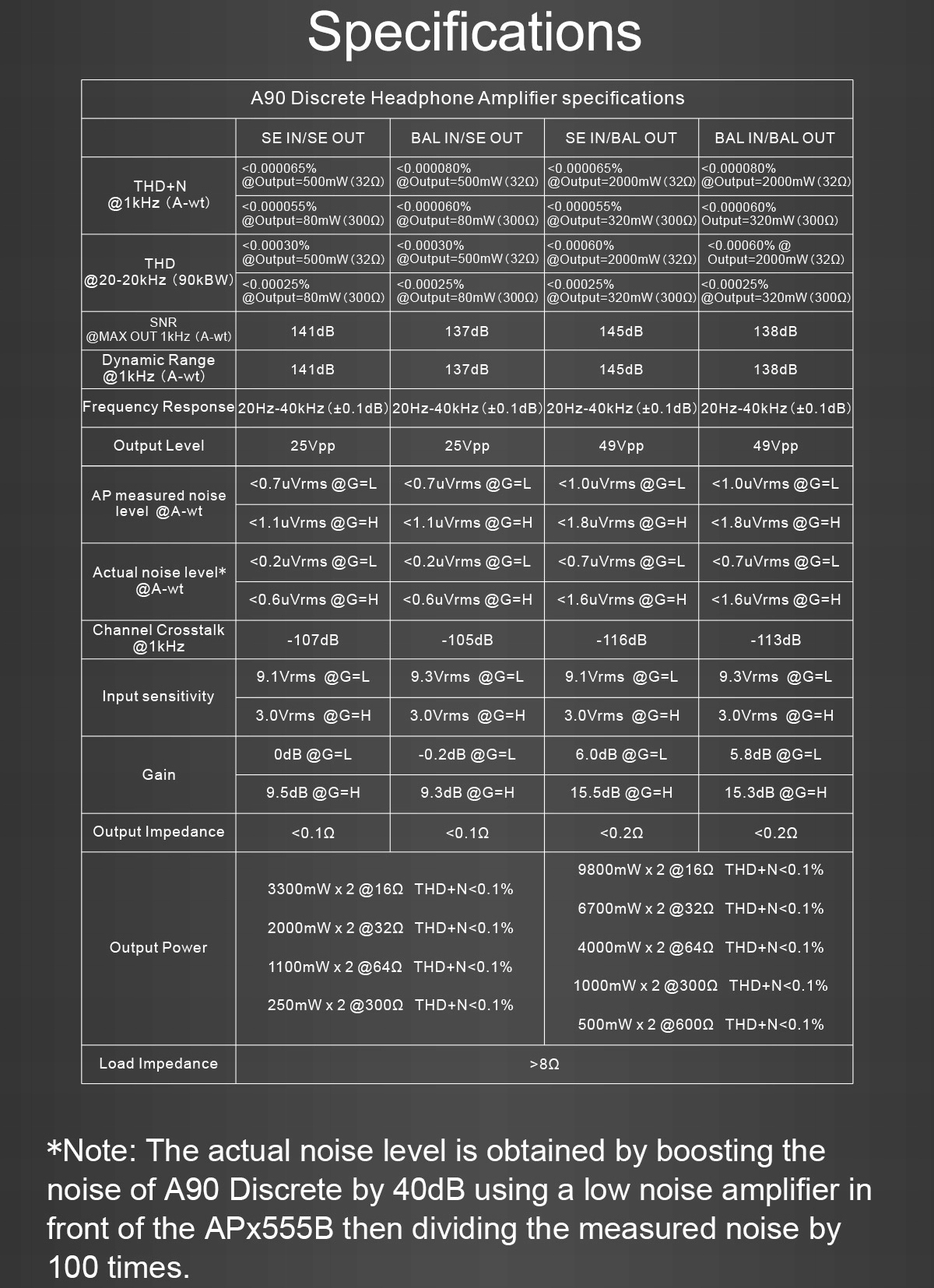 Topping A90 Discrete оснащено композитним підсилювачем із вбудованим зворотним зв’язком (NFCA), заснованим на використанні дискретних компонентів. Кожен із чотирьох вбудованих дискретних модулів NFCA використовує 39 транзисторів у збалансованій конструкції. Оптимізована гібридна архітектура зворотного зв’язку напруга/струм і технологія зворотного зв’язку з ультрависоким посиленням (UHGF) забезпечують чудову продуктивність постійного та змінного струму. Завдяки новому дизайну A90 Discrete має високу вихідну потужність, тож він може без зусиль супроводжувати як високочутливі, так і високоомні навушники. Точно підібрані наднизькошумливі транзистори, підключені паралельно, забезпечують надзвичайно низький рівень шуму та спотворень.