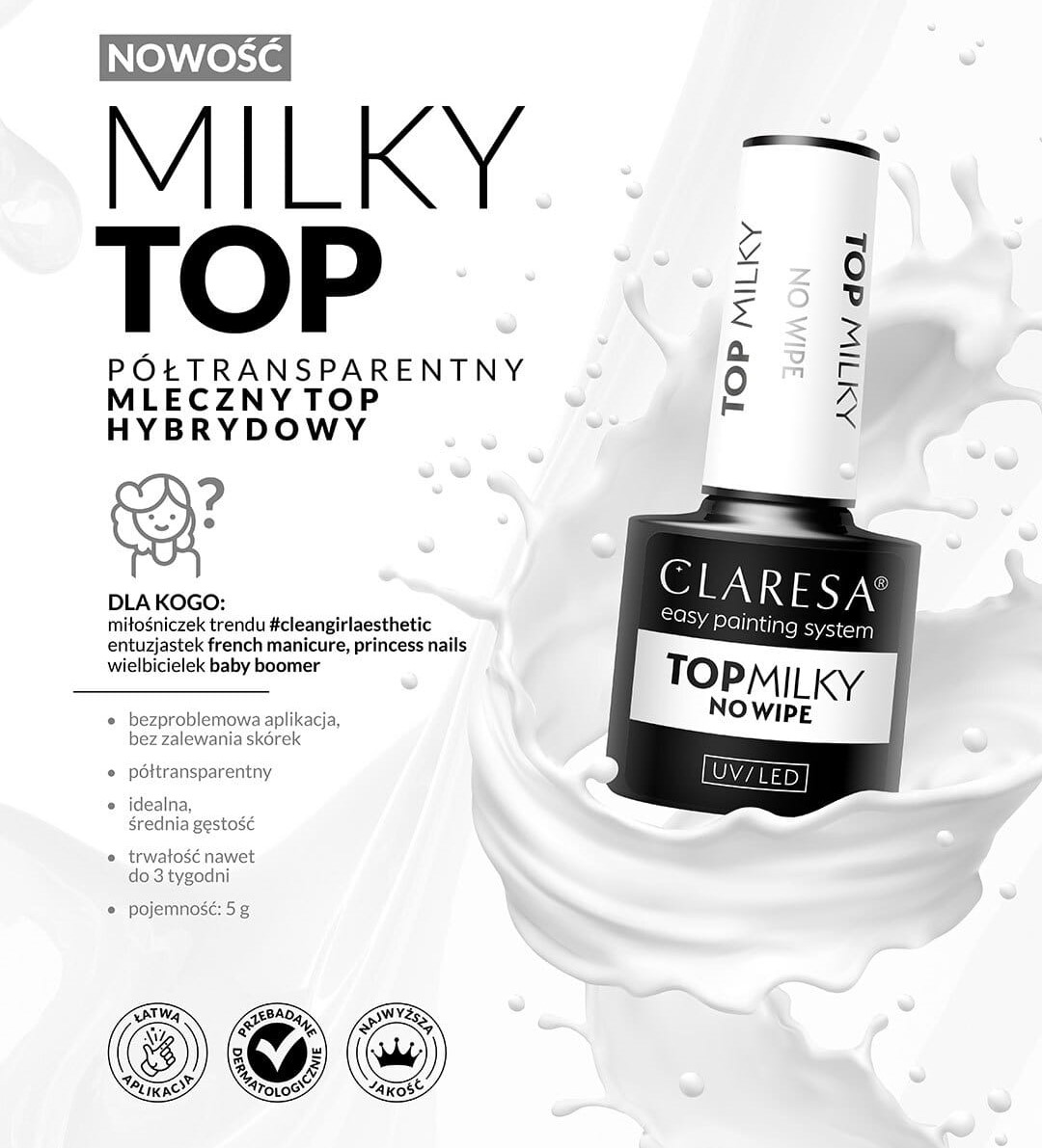 напівпрозорий молочний гібридний верх ідеально підходить для любителів тенденції #cleangirlaestetic, яка хоче тонко підкреслити природний колір їх плитки. Однак, якщо ви віддаєте перевагу виразні кольори, то молочний верх також для вас! Застосовуйте його до будь -якого відтінку гібридного лаку і подивіться, як молочний туман змінює свій зовнішній вигляд і надає йому делікатний характер.