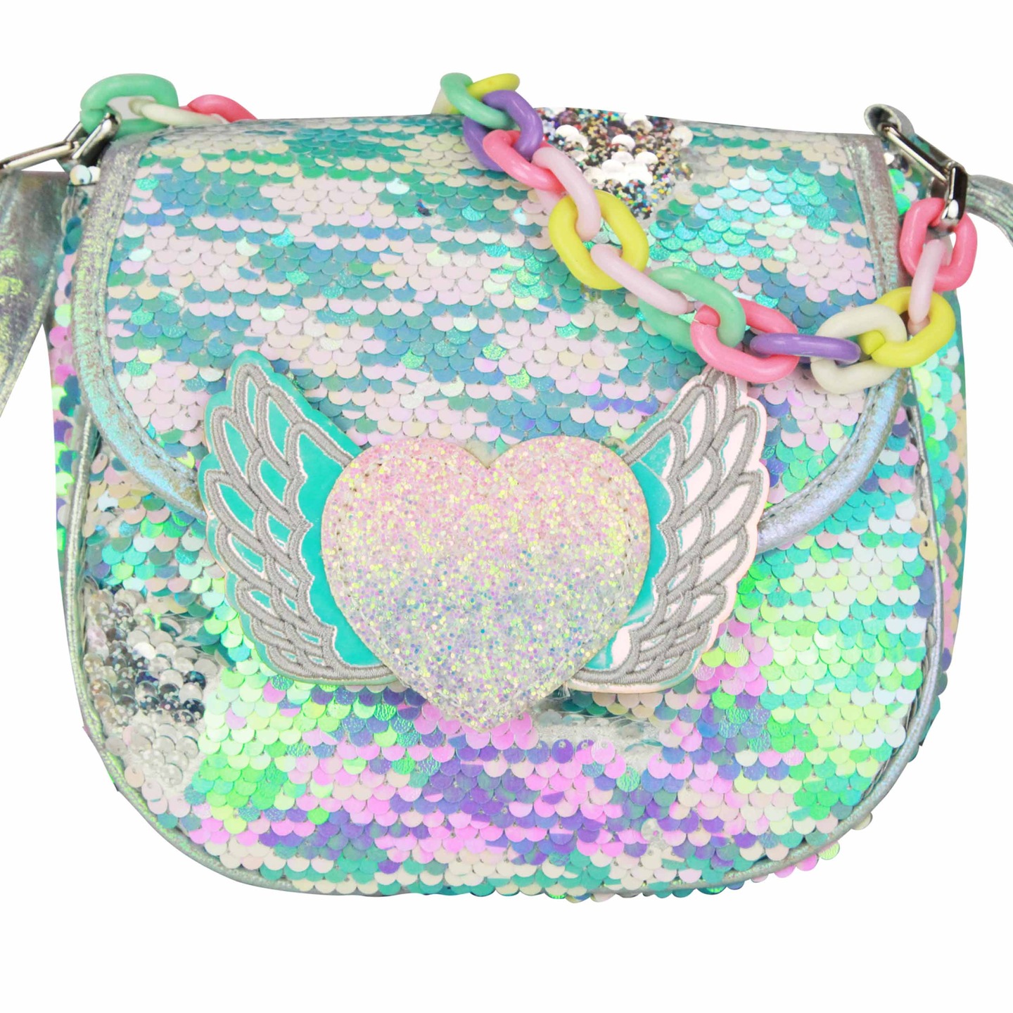 Дивно мерехтливі блискітки. На клапані сумки є блискуче серце з фантастичними голографічними крильцями, які додають сумці шарму. Додатково до сумки прикріплений кольоровий ланцюжок.