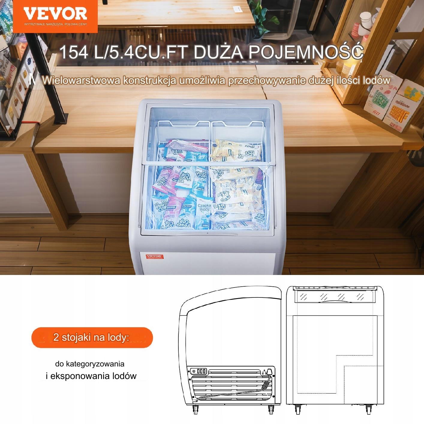 Великі вітринні контейнери для демонстрації різних смаків морозива. Прозорі скляні дверцята та світлодіодне освітлення посилюють ефект демонстрації. У нижній частині комерційного морозильника для морозива є додатковий простір для зберігання морозива з популярними смаками та інших харчових продуктів.