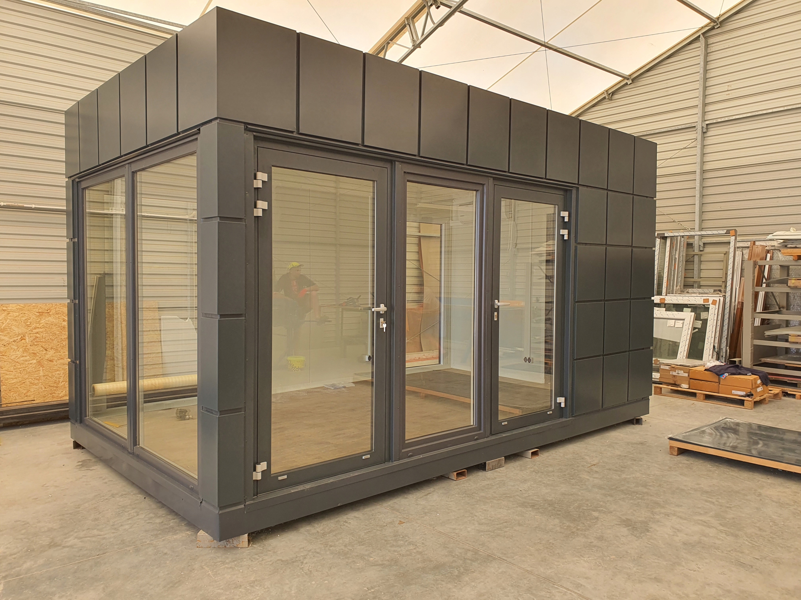- Підлога: Сендвіч-панель з серцевиною з пінопласту товщиною 100 мм, теплопроникністю 0,38 Вт/м2 К, додатково укріплена OSB плитою та оздоблена ПВХ-вагонкою