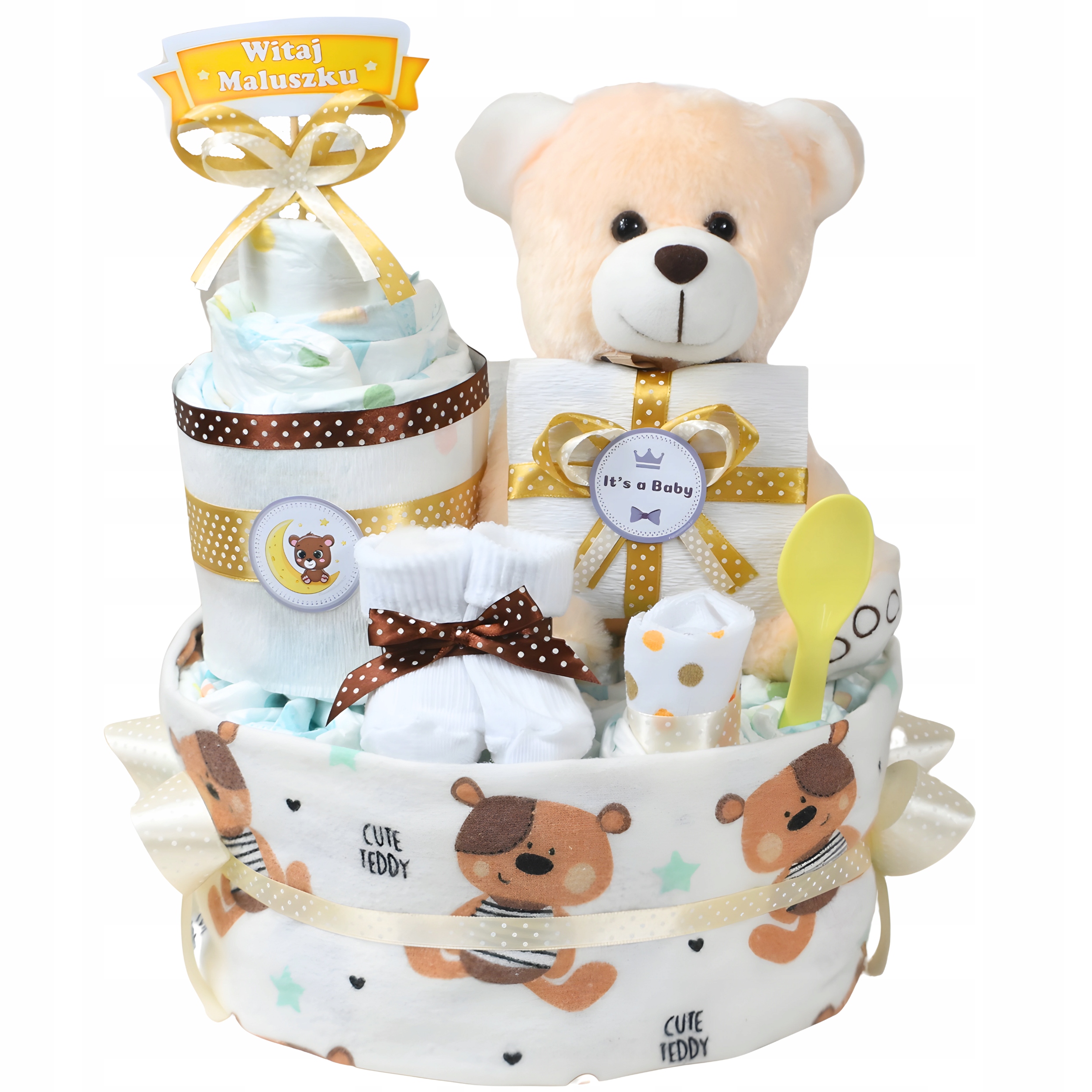 Торт з підгузків — ідеальний подарунок народження дитини, хрещення або інші свята, такі як свято дитини, день народження, іменини, перший візит до дитини, рік і т. д. Після розбирання подарунка всі пелюшки та аксесуари корисні та необхідні для дитини та батьків.