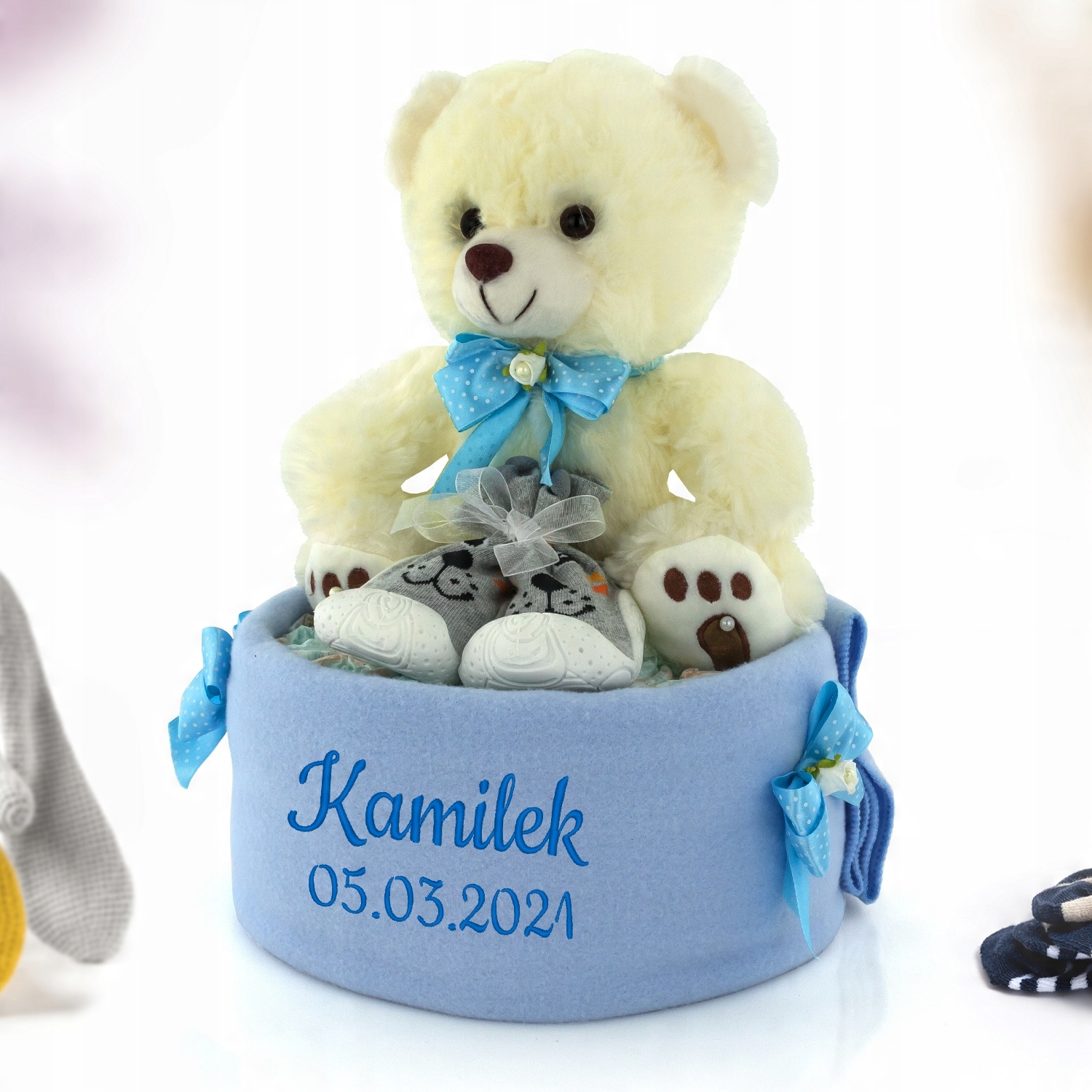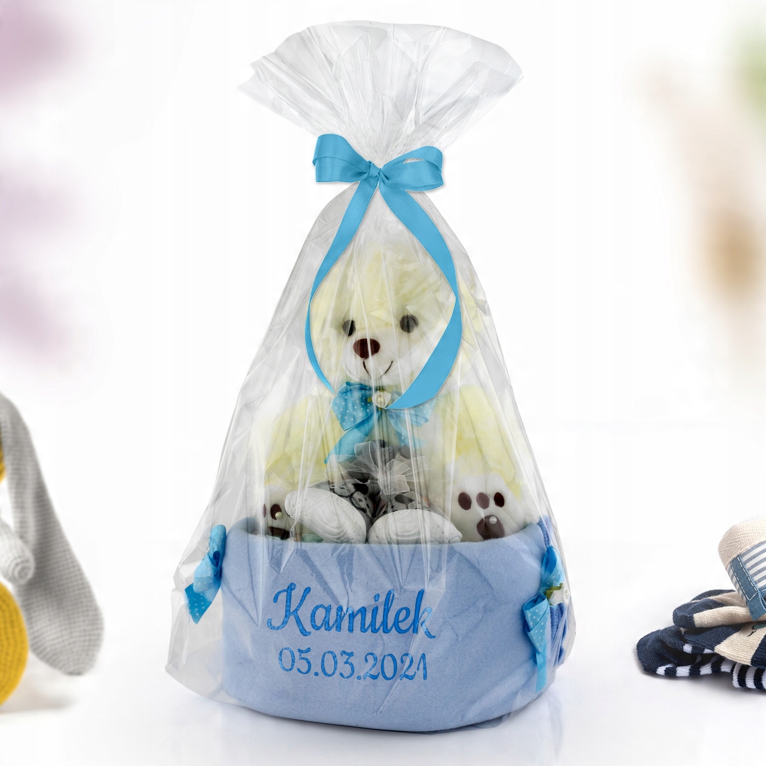 Унікальний торт для малюка, до складу якого входять ковдра, м'ясо, шкарпетки та пелюшки - надзвичайно практичний подарунок на хрещення або день народження дитини. Пелюшки складені по колу, загорнуті в ковдру і прикрашені атласною стрічкою. Талісман виготовлений з високоякісного плюшу, що забезпечує безпечну гру та дозволяє тренувати моторику та ручні навички вашої дитини (хватання, пересування тощо). Різноманітність кольорів і структур вчить дітей їх розрізняти і впливає на позитивний розвиток дитини.