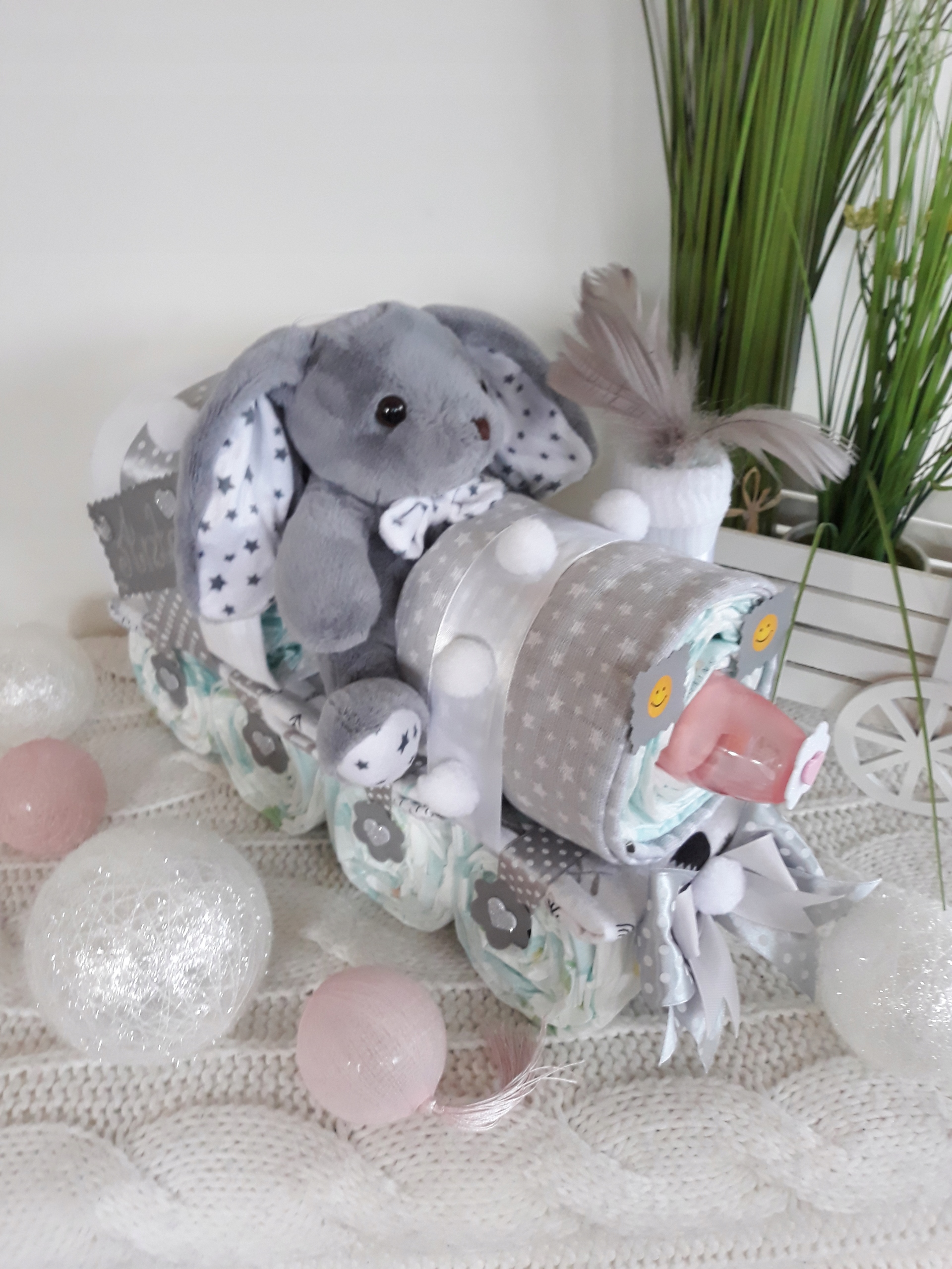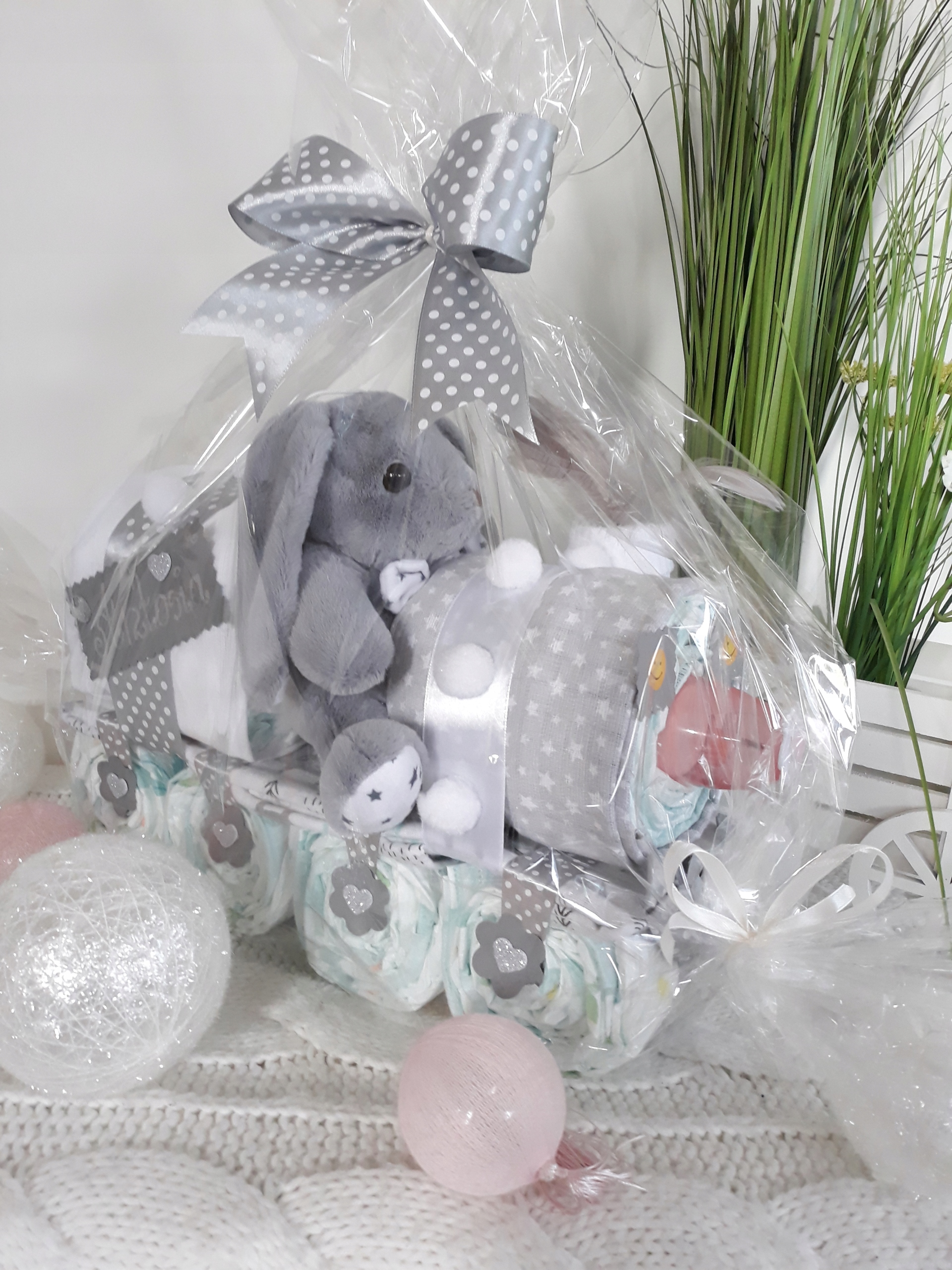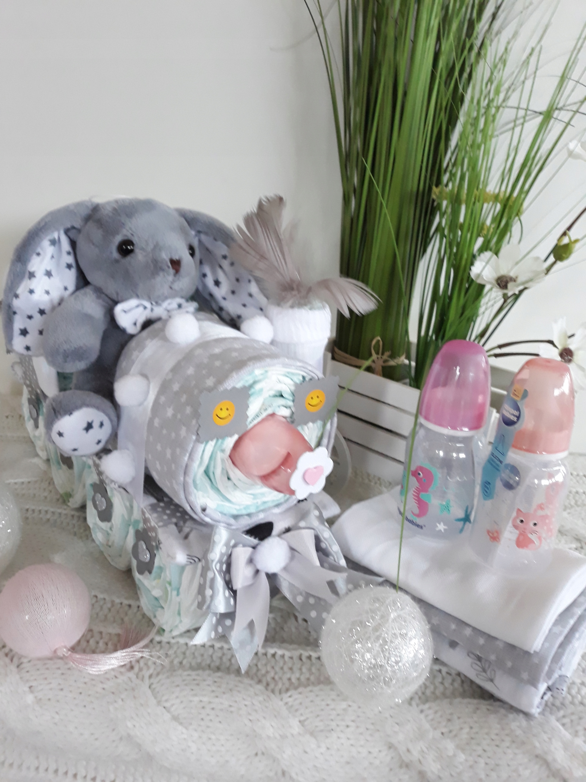 Унікальна красива іграшка з оригінальних підгузків PAMPERS 5 з чудовим плюшевим зайчиком від відомої КОМПАНІЇ SUN-DAY, a Пляшечка CANPOL 120 мл, шкарпетки та різнокольорові пелюшки в модних кольорах.