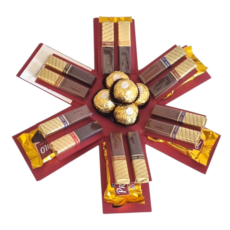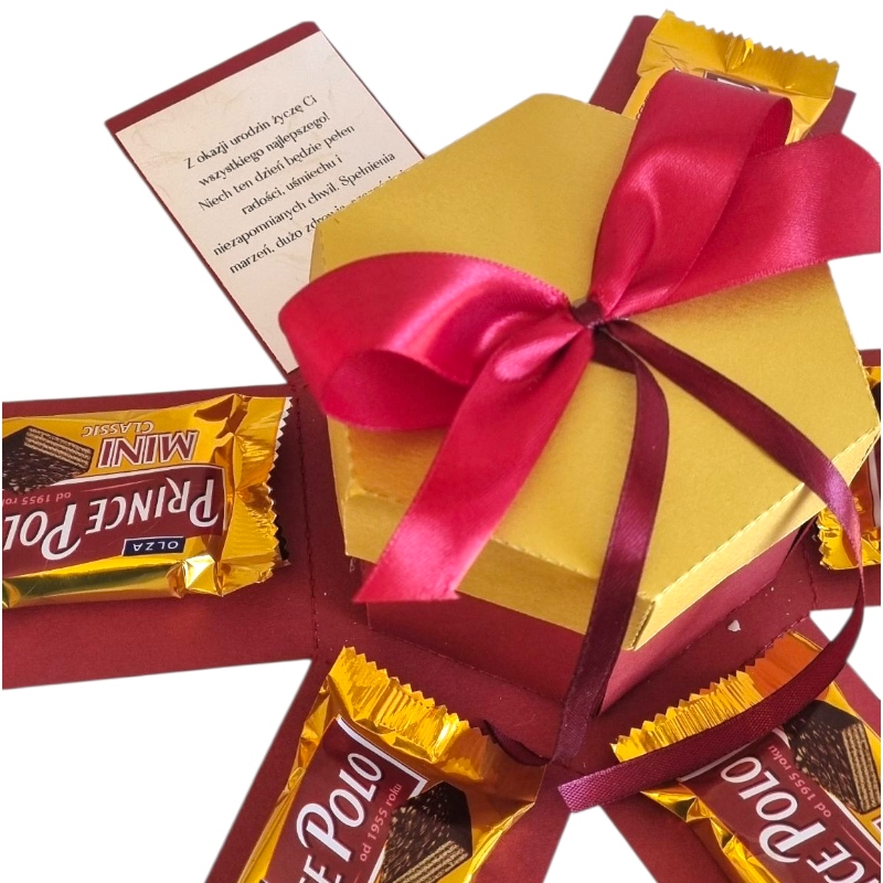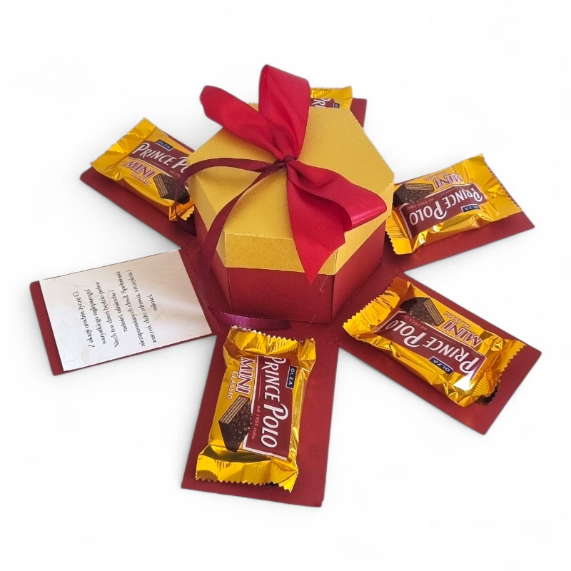 Здивуйте одержувача, як тільки він знімає кришку, здивована шістьма сторонами з шести сторін, де розміщені 5 міні -вафлі принца Поло, і є бажання, щоб ми могли вільно персоналізувати, все, що ви повинні зробити, - це ввести те, що має бути включеним на них, і ми друкуємо їх на декоративному папері та вставити їх. Ми самі з товстого барвистого картону, основи в Бургундії, а кришка зроблена золотом. Ціле закінчено червоною бордовою стрічкою.