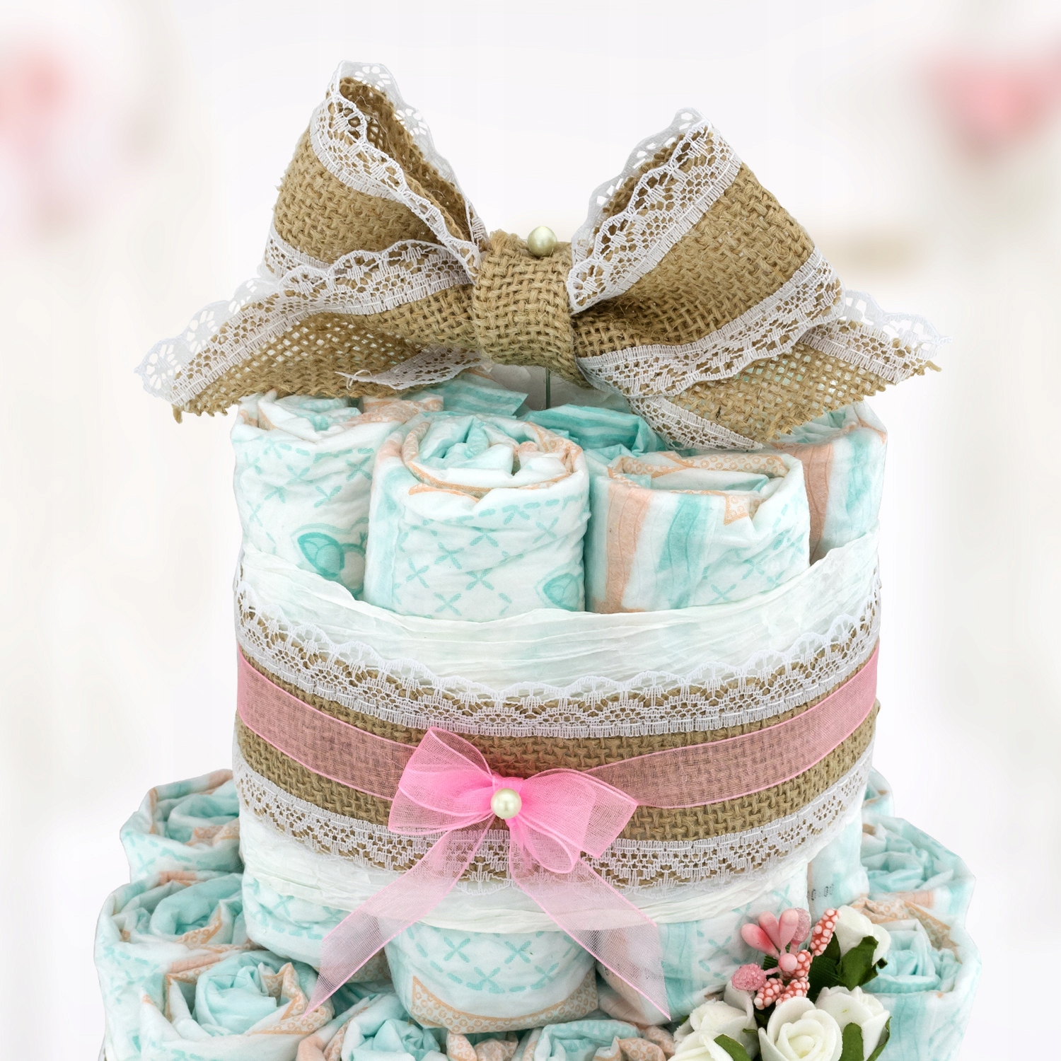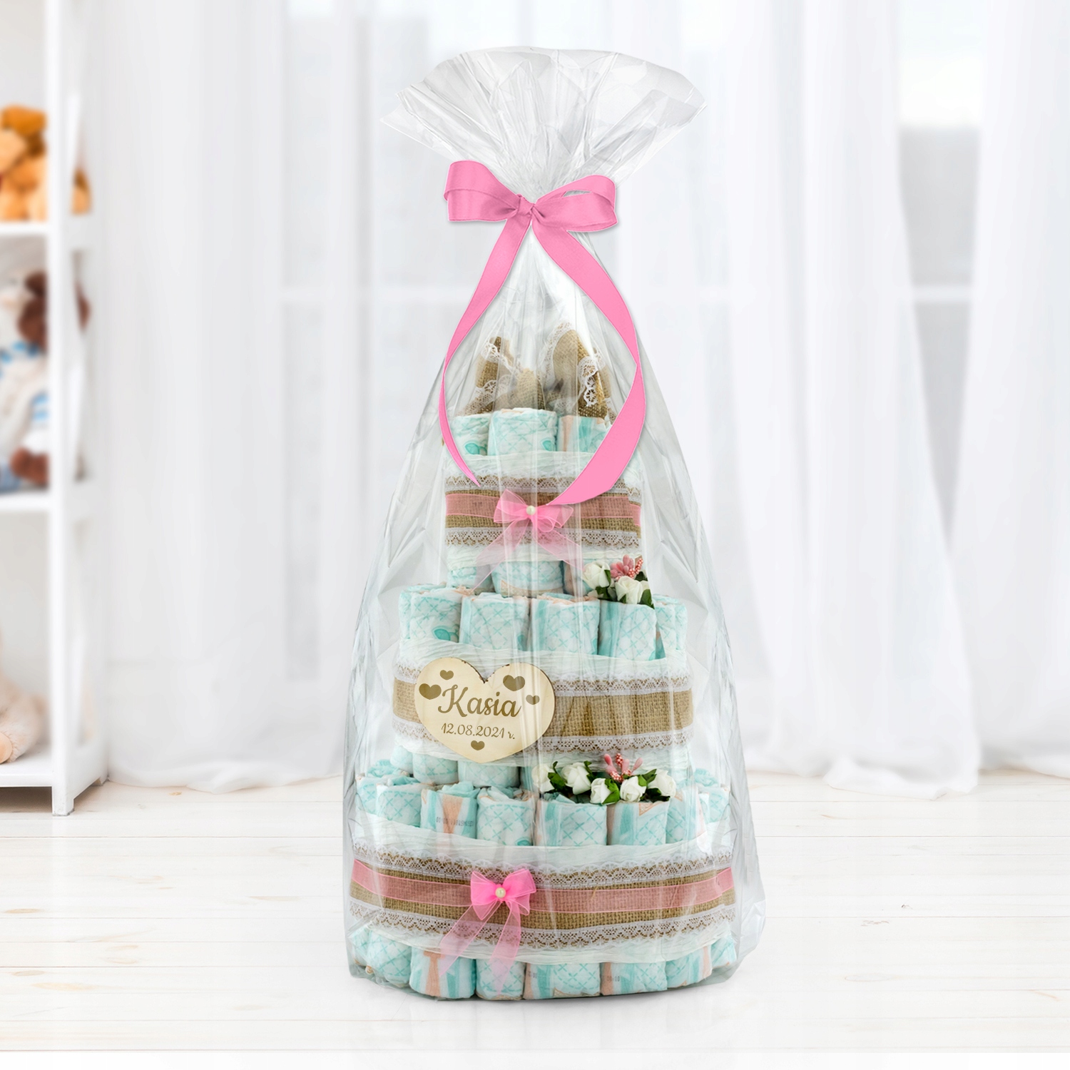 Унікальний торт для малюка, до складу якого входять 59 пелюшок і дерев'яне сердечко з персоналізацією - надзвичайно практичний подарунок на хрестини і день народження дитиниабо дитяче свято. Підгузки складені у формі багатоярусного торта, прикрашеного стрічками та бантами.
