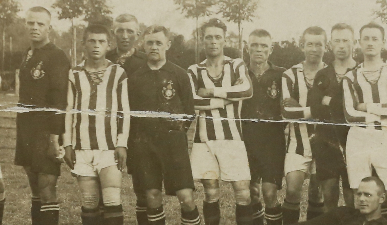 Оригінальна, надзвичайно цікава та винятково рідкісна довоєнна військова фотографія, футбольна команда IIRP TORUŃ 8 саперного батальйону, формат 15 х 9 см. Стан хороший - фото пошкоджене, з проклеєним вертикальним зламом та обрізаними кутами. Перегляньте інші мої аукціони.