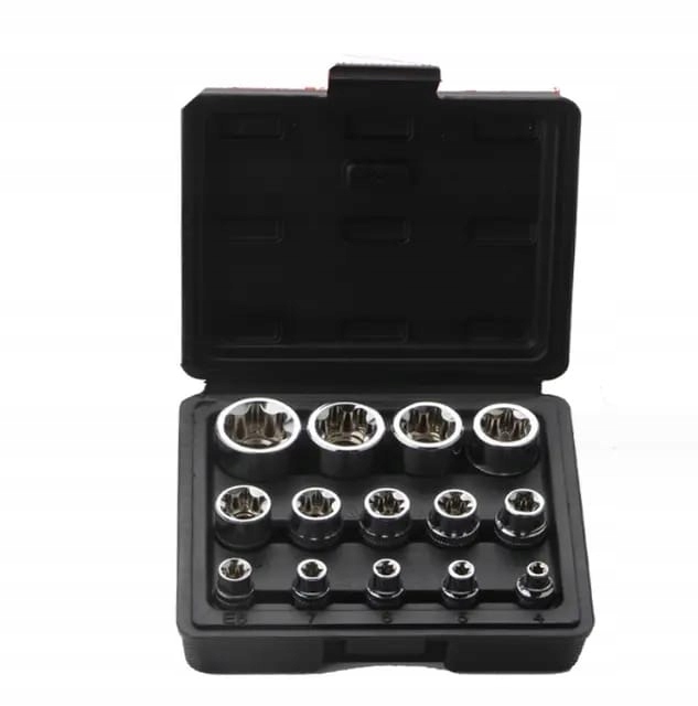 набір вкладень e-torx для 1/2 ", 3/8" та 1/4 ". Набір обережно і точно виготовлений з високо міцної сталі хрому-ванадію (CRV), що значно збільшує їх міцність і життя. валіза.
