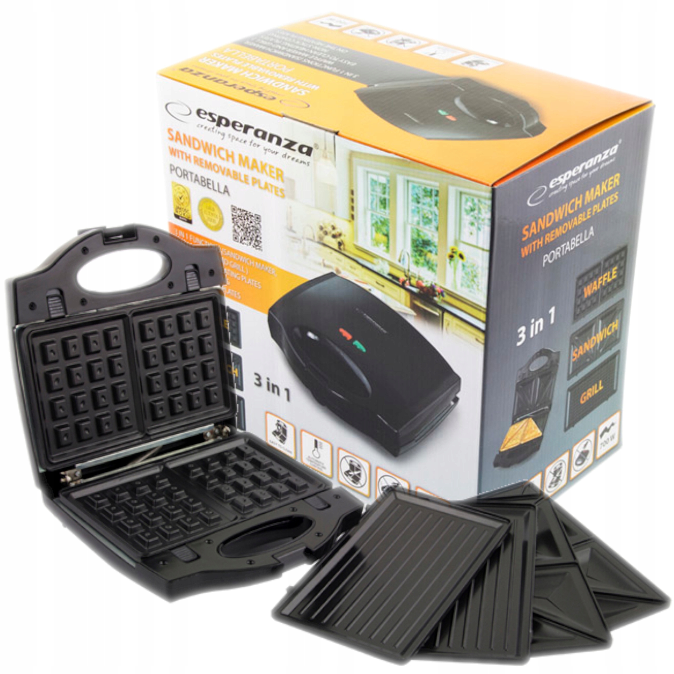 Універсальний тостер Esperanza PORTABELLA 3 в 1 — це пристрій, призначений для приготування таких страв, як сендвіч-вафлі або паніні. Ви можете заощадити багато місця, замінивши кілька пристроїв на більш вузькі додатки.
