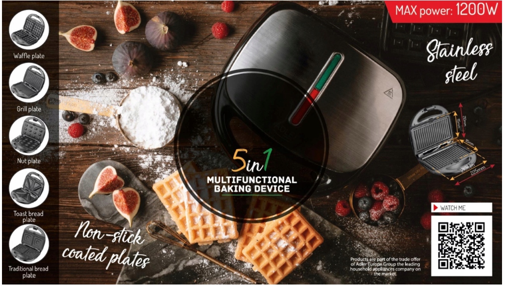 Цього разу вам не потрібно себе обмежувати! Скільки разів нам доводилося вибирати, який пристрій купити та який один буде кориснішим вдома? Хтось із сім’ї любить тости, а вам час від часу хочеться поласувати «горіховим» печивом? У нас є ідеальне рішення! Наш тостер поєднує в собі не дві чи три, а п'ять найпопулярніших функцій тостера! Прилад оснащений трикутними пластинами для бутербродів з підсмаженим хлібом. Теплий сніданок за кілька хвилин для кожного члена сім'ї! Для традиціоналів ми рекомендуємо квадратні тарілки, на яких можна підсмажити сендвічі з традиційного хліба. Плюс контактний гриль для гриля з обох сторін, який стане в нагоді на кожній вечірці, не тільки влітку! Для найменших і дорослих любителів солодощів є тарелки для випікання вафель. А повним бонусом є формочки для випікання «горіхового» печива. Хто не пам'ятає ці смаколики солодощі! Завдяки такому великому вибору кожен домочадець знайде щось для себе!