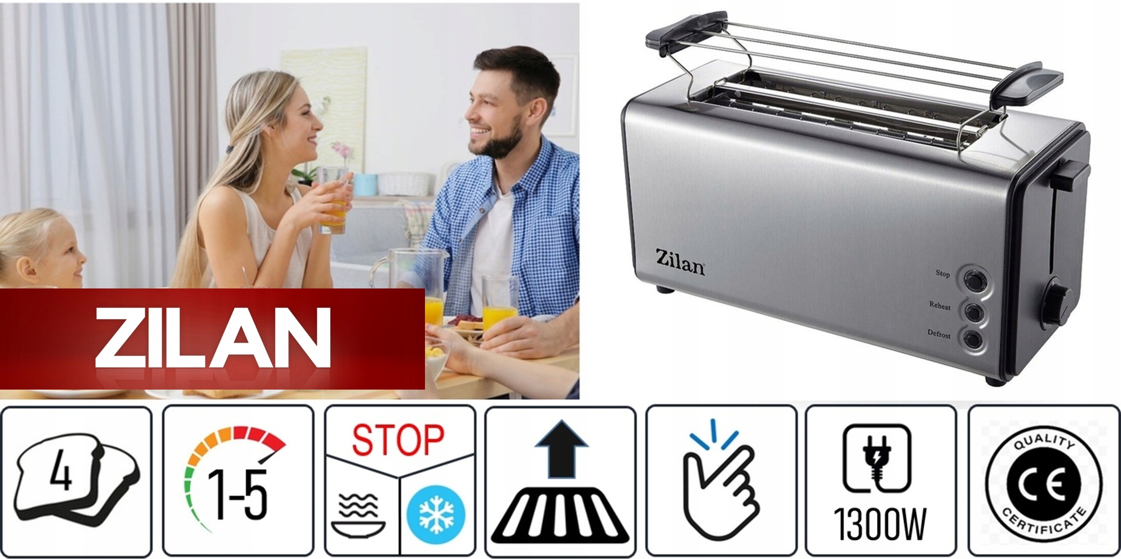 Відкрийте для себе нову якість підготовки сніданків з тостером Zilan для чотирьох шматочків . Насолоджуйтесь кращим ступенем випічки завдяки 5 рівнем догляду. Ціле доповнюється елегантним сучасним дизайном , який буде ідеальним доповненням до кожної кухні.
