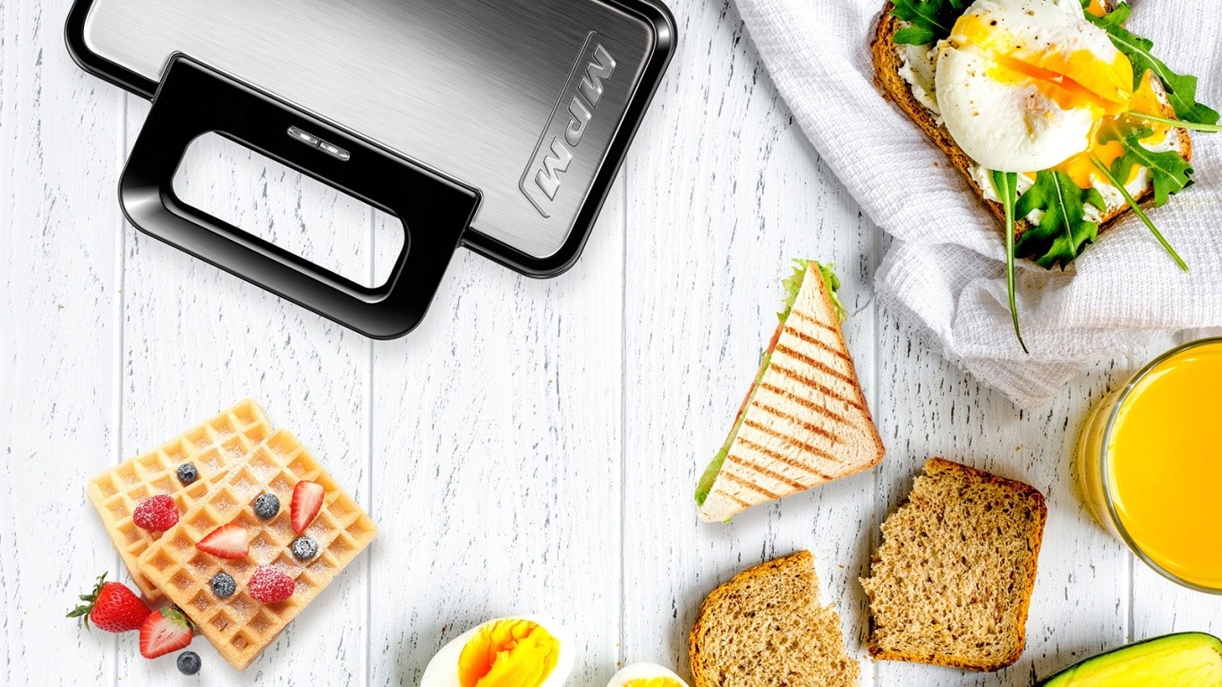 Тостер 3 в 1 від MPM потужністю 1000 Вт для одночасного приготування 4 трикутних бутербродів >, 2 вафлі та гриль. Корпус з нержавіючої сталі. Знімні пластини, покриті антипригарним покриттям - легко підтримувати в чистоті. Термостат автоматично регулює температуру. Світловий індикатор робочого стану та підключення до мережі. Місце для змотування мережевого кабелю. Можна зберігати у вертикальному положенні. Змінні тарілки для вафель, сендвічів і тарілки для гриля.