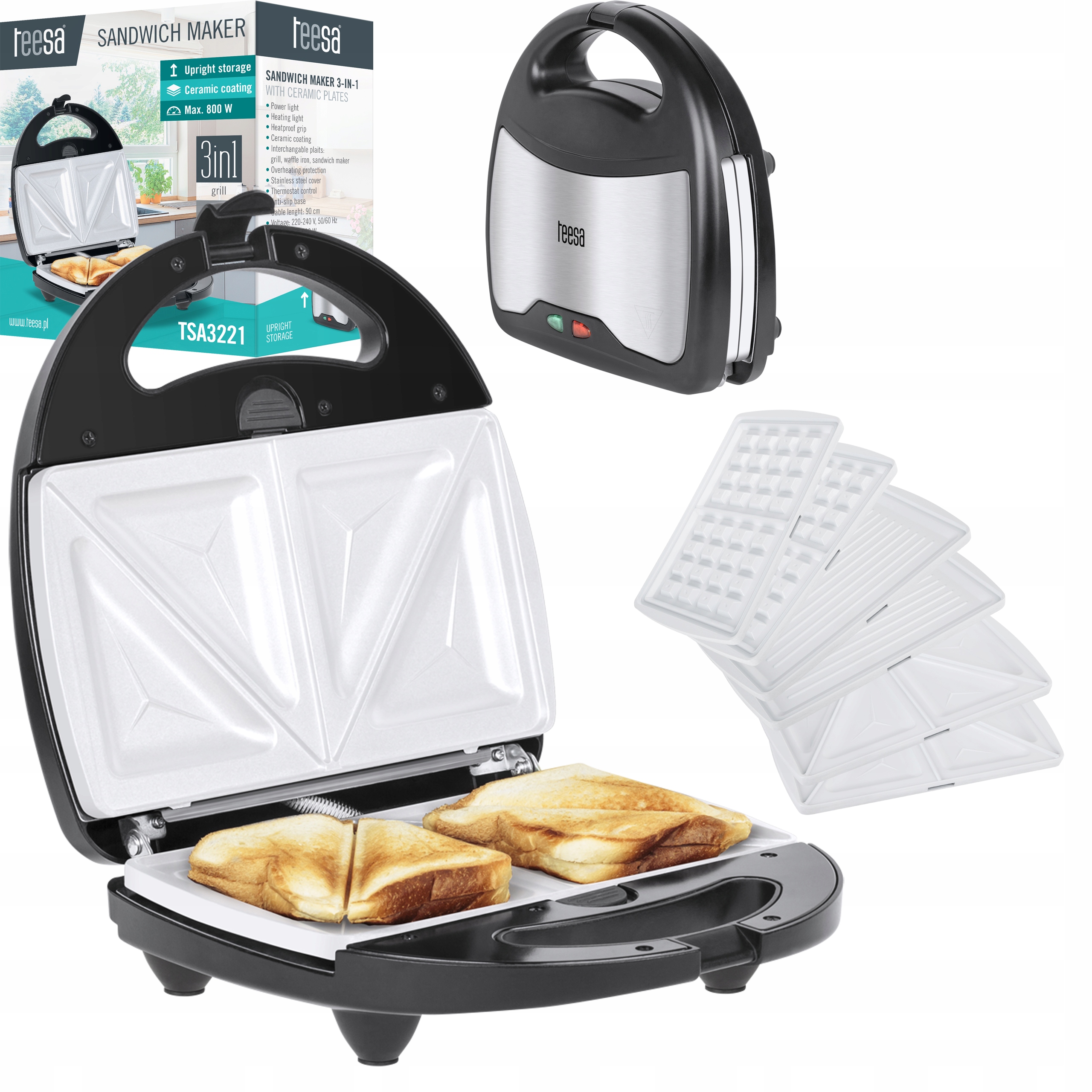 Хочете приготувати смачну закуску для гостей? А може звичайного тостера вам просто недостатньо? TSA3221, завдяки змінним вставкам: для гриля, приготування вафель і підсмажування бутербродів, дозволить замінити три прилади одним. Тостер має максимальну потужність 800 Вт, що гарантує дуже швидке нагрівання, а отже, і приготування їжі. Крім того, використання антипригарних керамічних пластин забезпечує надзвичайно легке очищення.