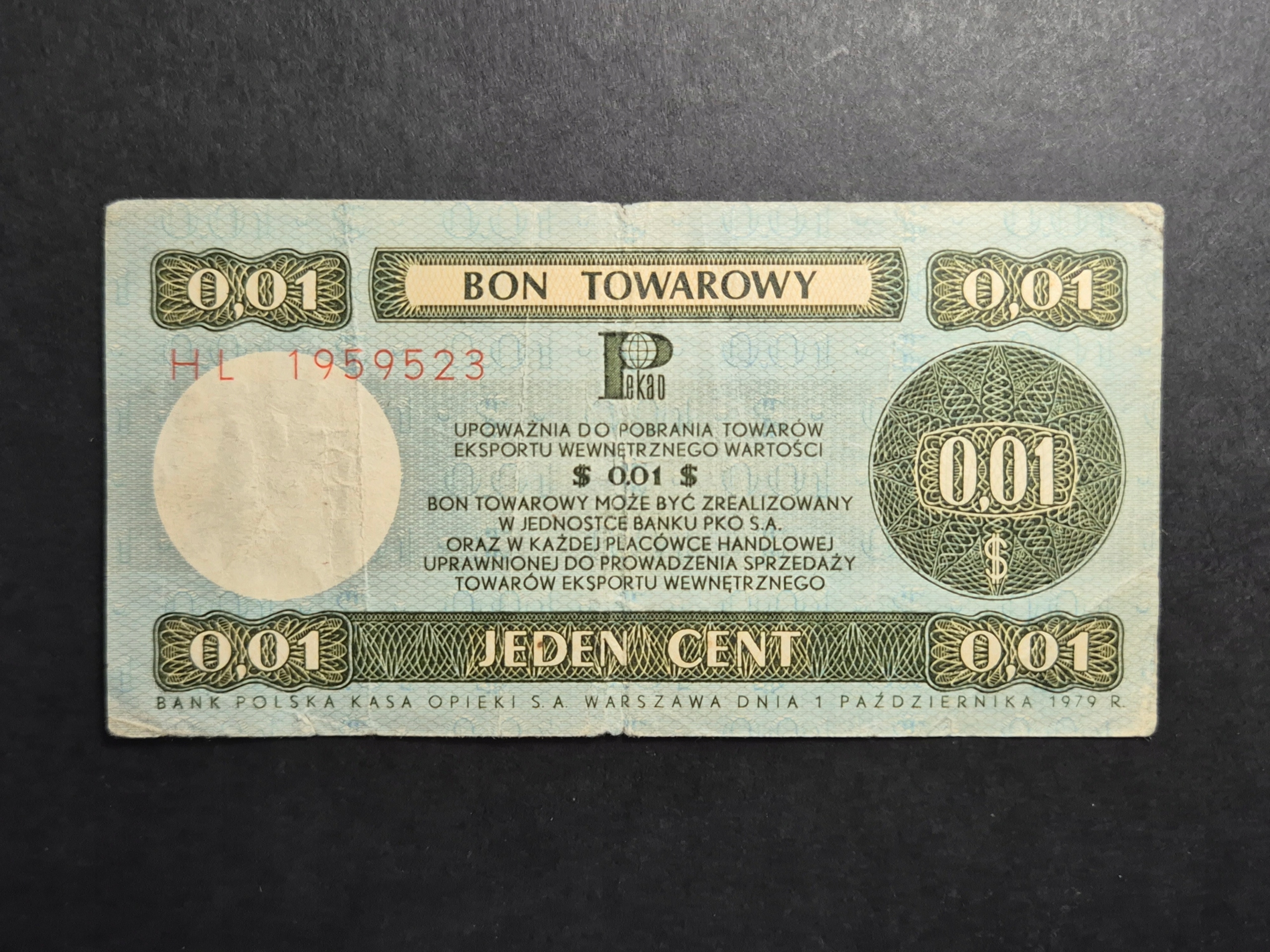 Ваучер на товари Pewex 1979 року випуску 1 цент