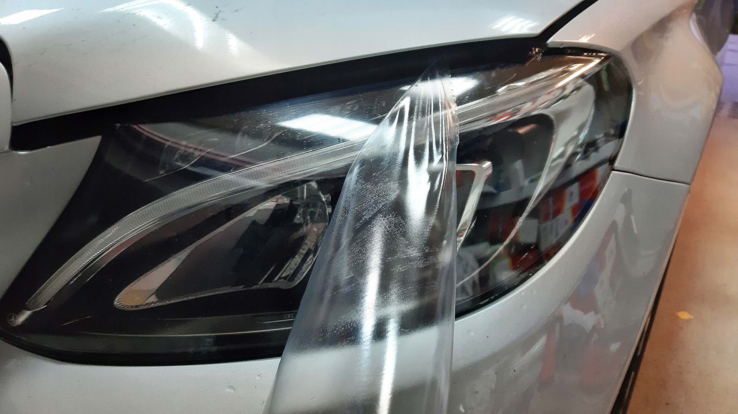 Після нагрівання фольга стає більш пластичною і її можна клеїти на злегка закруглені елементи. Нижче наведено приклад нанесення на фари Mercedes C-класу, які, як видно на другому фото, дуже закруглені і залишають великі надлишки фольги як у верхній, так і в нижній частині лампи.