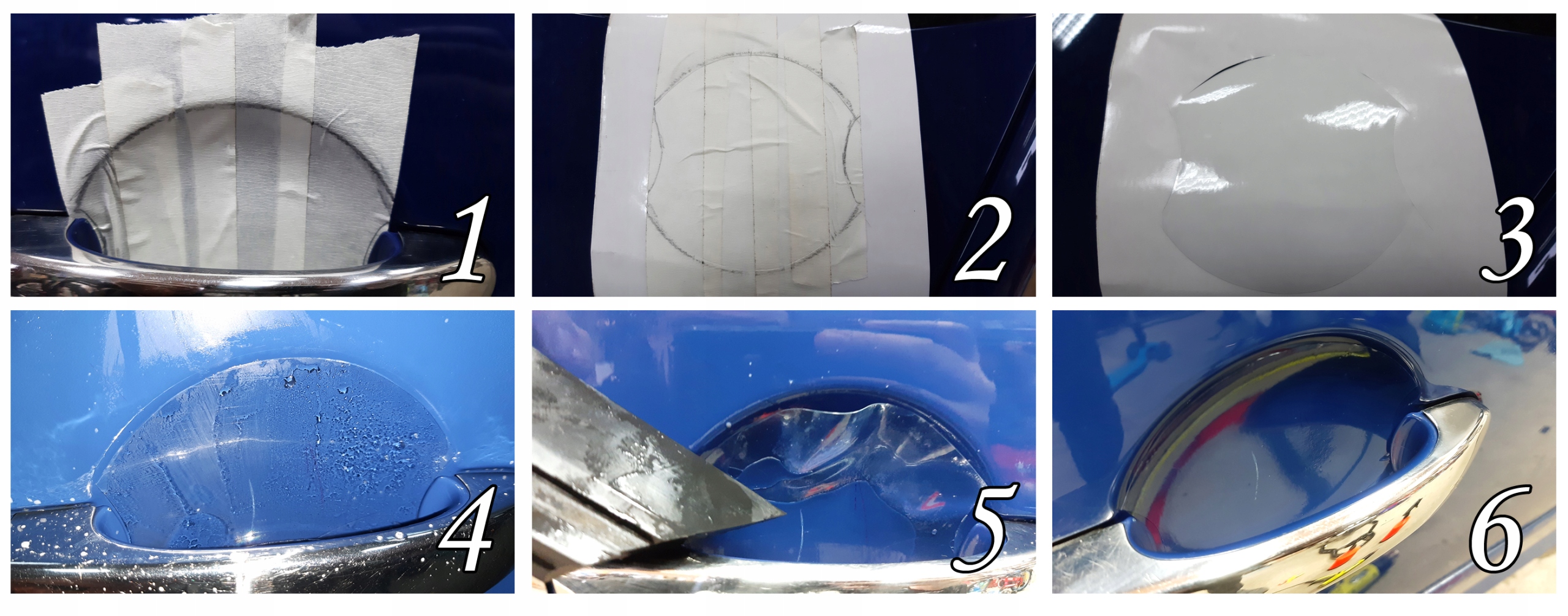 Наклеюємо, наприклад, паперову стрічку до місця, куди ми хочемо наклеїти фольгу, і з краєм позначте всі краї олівцем (фото 1). Потім відклеюємо скотч так, щоб він залишився цілим, і наклеюємо його на фольгу ORAGUARD (фото 2). Вирізаємо гострим ножем з внутрішньої сторони ескіз на відстані 2-3 мм від намальованих країв і отримуємо готовий формат (фото 3). Далі переходимо до нанесення, тобто очищення місця, знежирення та обприскування демінералізованою водою (фото 4). За допомогою ракеля і термопістолета або сушарки профілюємо фольгу в поглибленні ручки (фото 5). На останньому фото (фото 6) видно вже наклеєну фольгу [біла подряпина, на жаль, слід від грунтовки, яку ми не можемо замаскувати фольгою].