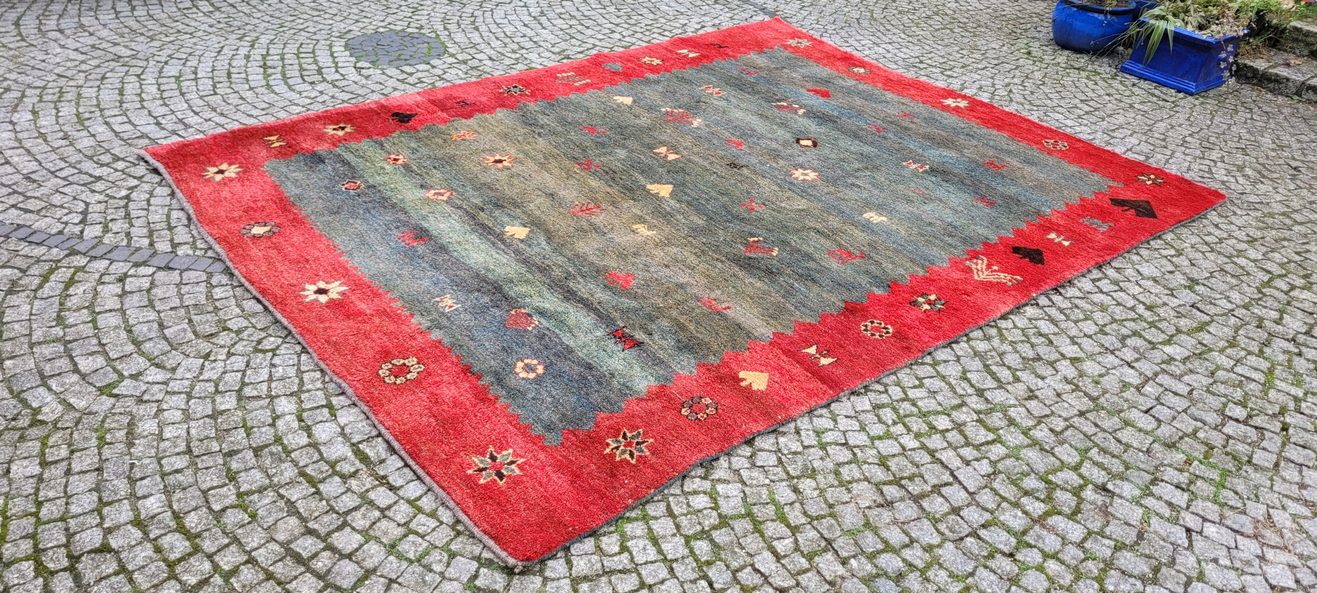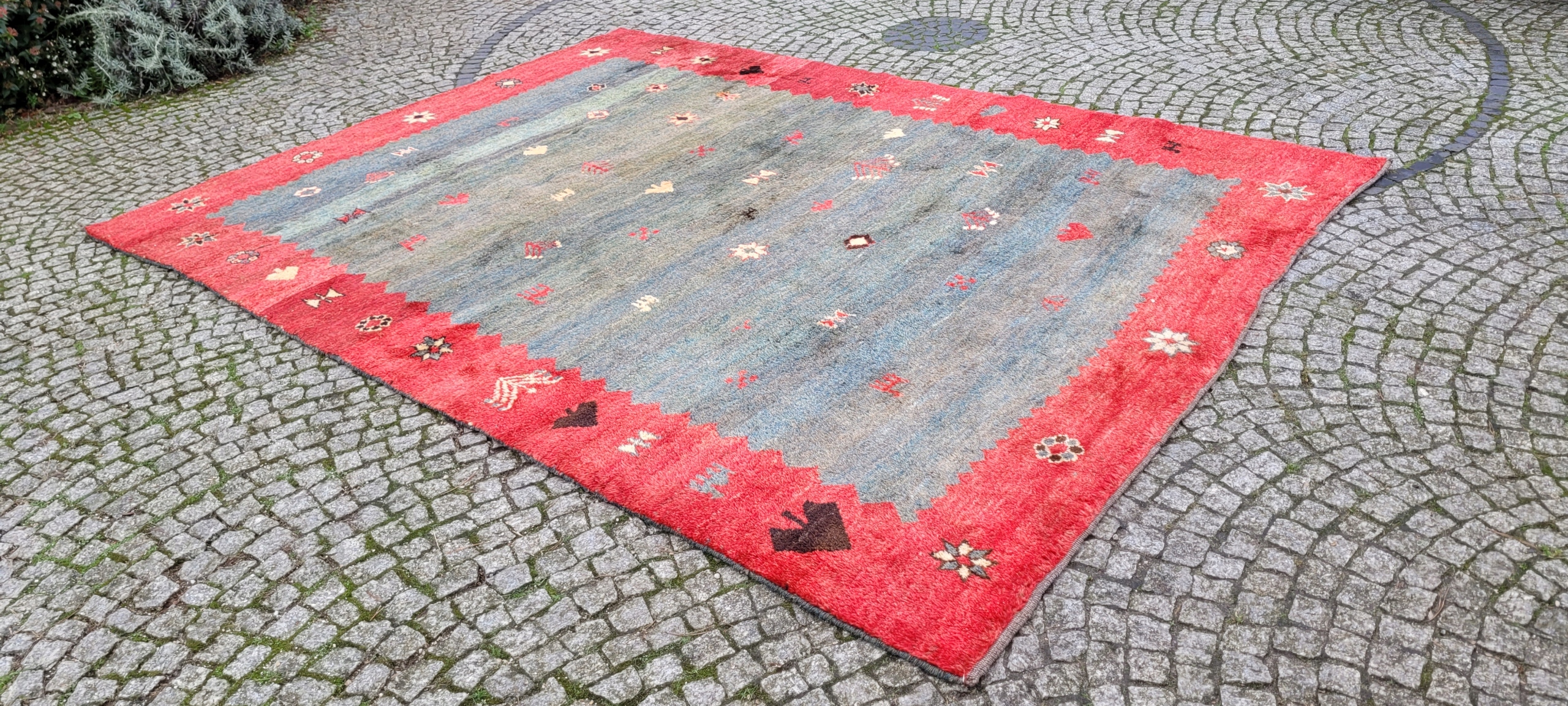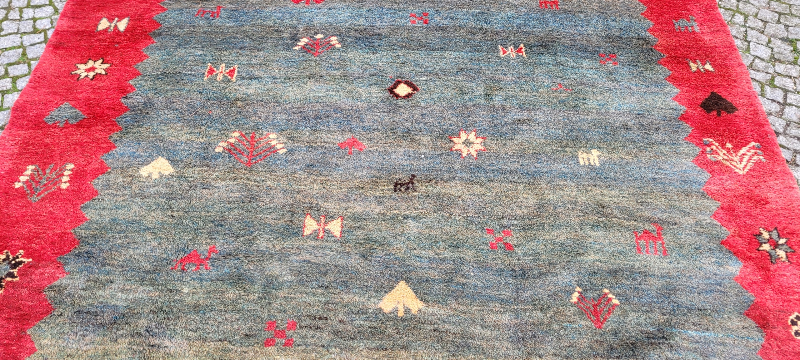 Перський килим Gabbeh. Виткана вручну з вовни найвищої якості. Характеризується приємним на дотик високим блискучим флісом і красивими потертими кольорами та візерунками. Він у дуже хорошому стані.