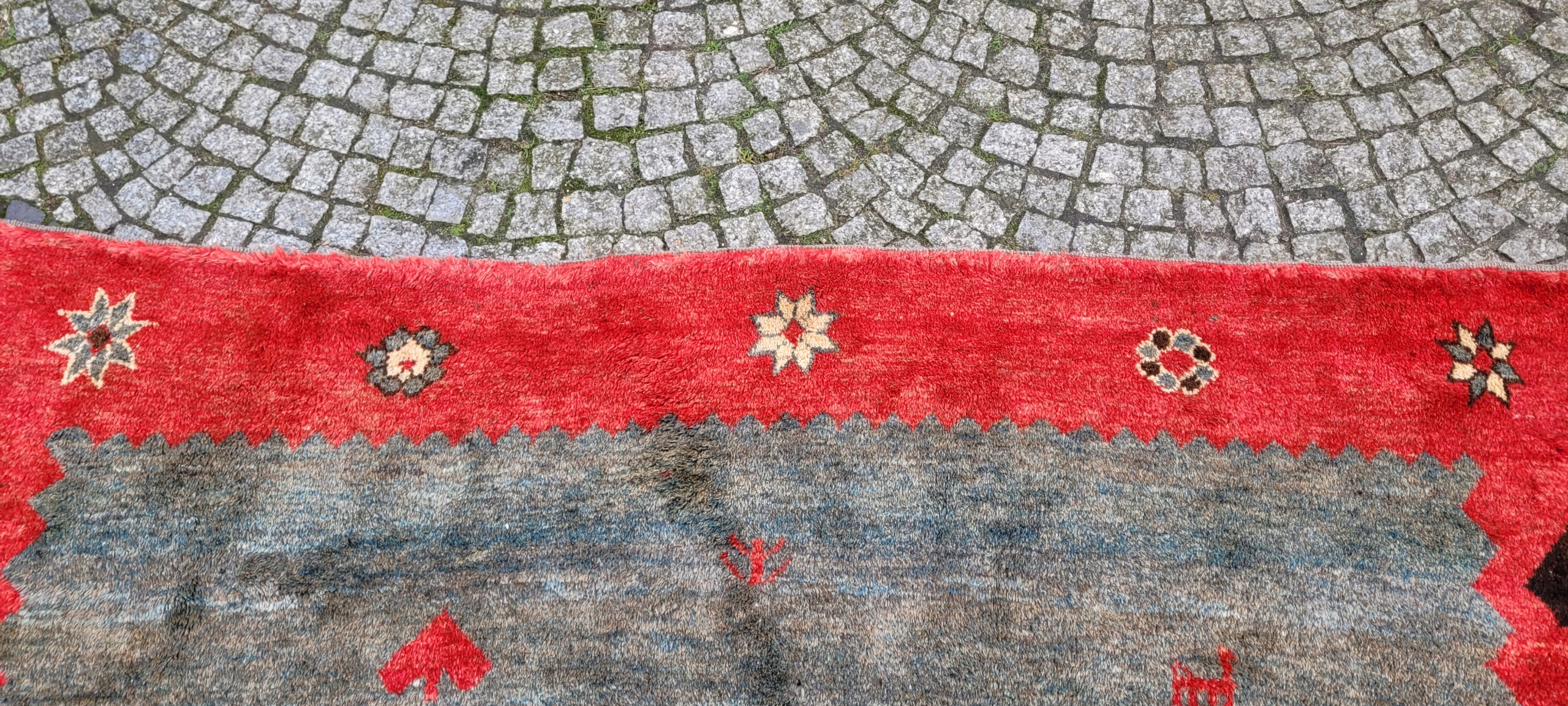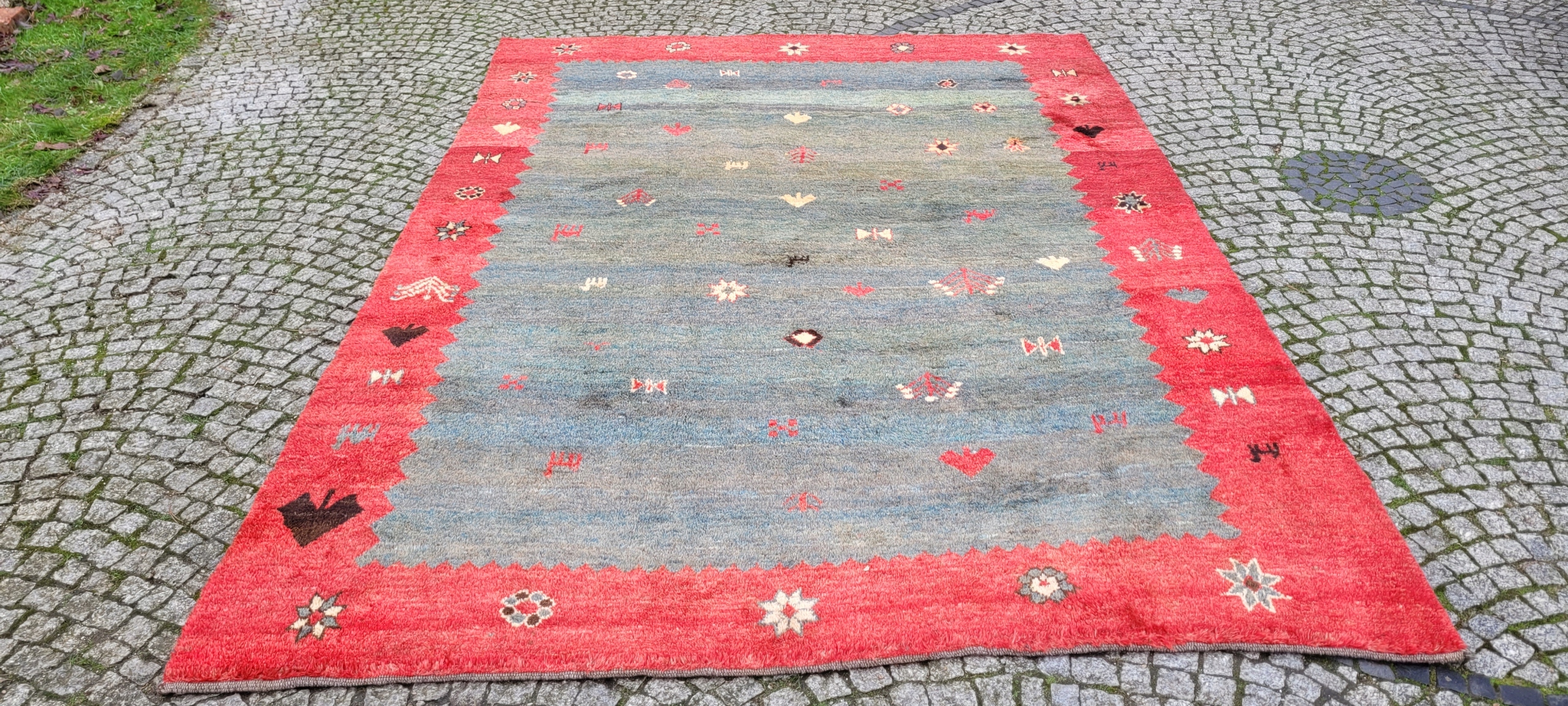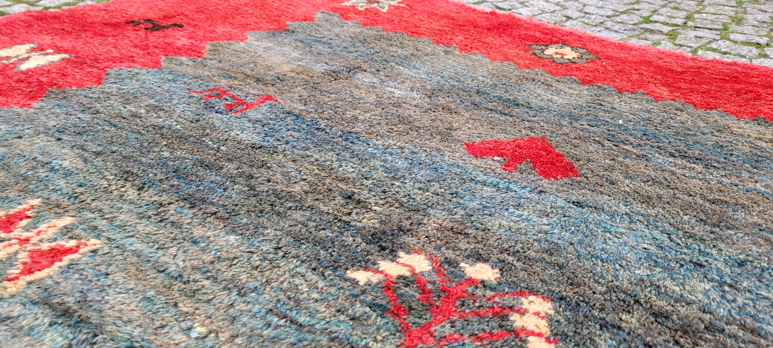 Перський килим Gabbeh. Виткана вручну з вовни найвищої якості. Характеризується приємним на дотик високим блискучим флісом і красивими потертими кольорами та візерунками. Він у дуже хорошому стані.