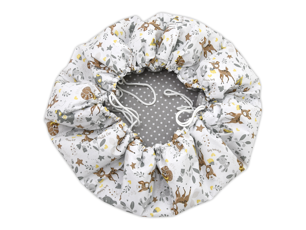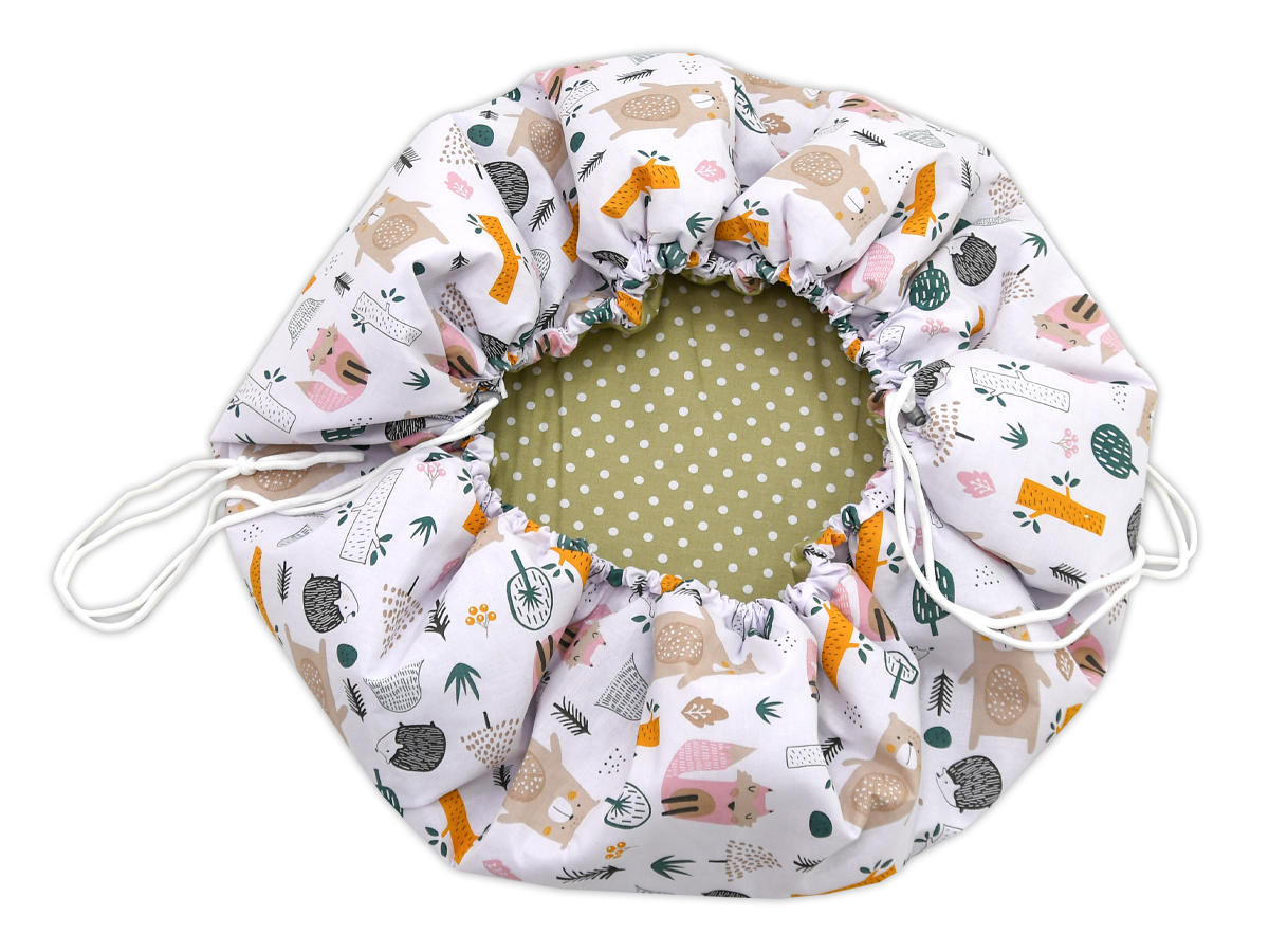 - він має тунель на краю, через який протягується шнурок, перетворюючи килимок на сумку для іграшок.