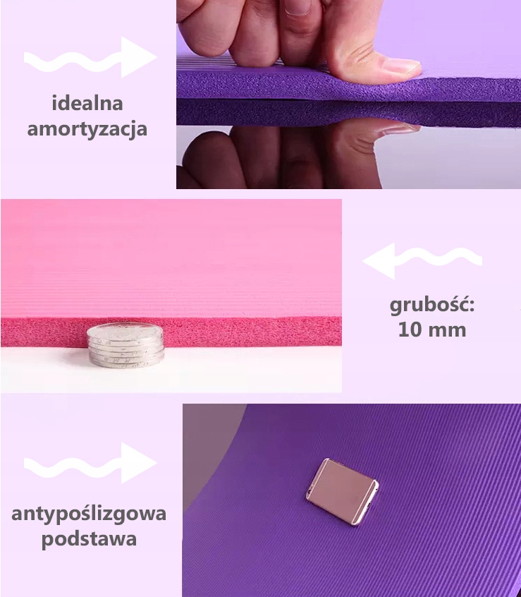 Виготовлений з піни NBR, робить килимок дуже гнучким і міцним. Незважаючи на те, що його щодня згортають для транспортування або зберігання, килимок не деформується, а після розгортання зберігає високу ступінь еластичності та еластичності. Крім того, він не ковзає - не рухається під час тренування.