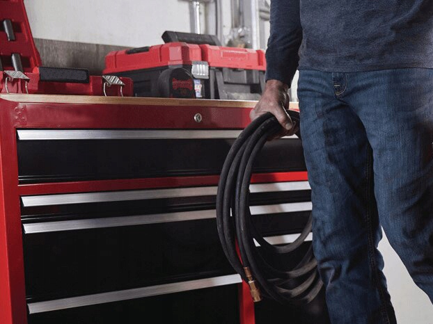 Шланг призначений для подачі стисненого повітря до всіх типів інструментів, таких як молотки, шліфувальні машини, фарбувальні пістолети, дзиги. Він захищений від механічних пошкоджень товстим гумовим чохлом, а оскільки він не спіральний, його легко намотати на барабан. Найбільшою перевагою є те, що він виготовлений із маслостійкої, гнучкої та стійкої до тиску гуми.