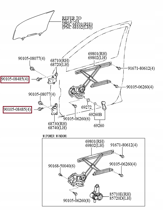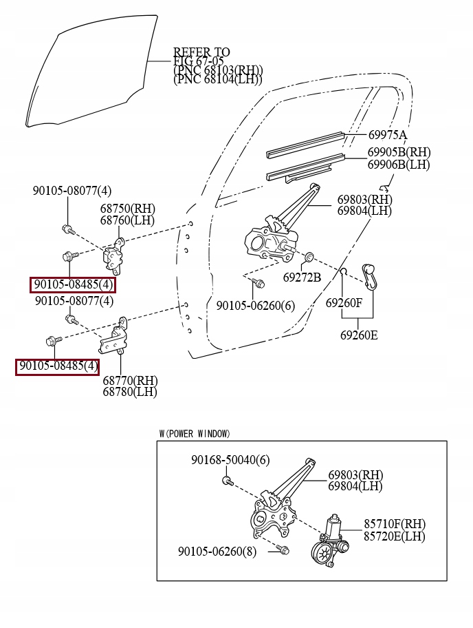 На схемі групи регуляторів вікон кузовів/передніх дверей і петлі гвинт 90105-08485 відображається як болт, фланець і використовується для прикручування петлі до стійки/обшивки дверей, що забезпечує правильне розташування та жорсткість монтажу петлі.