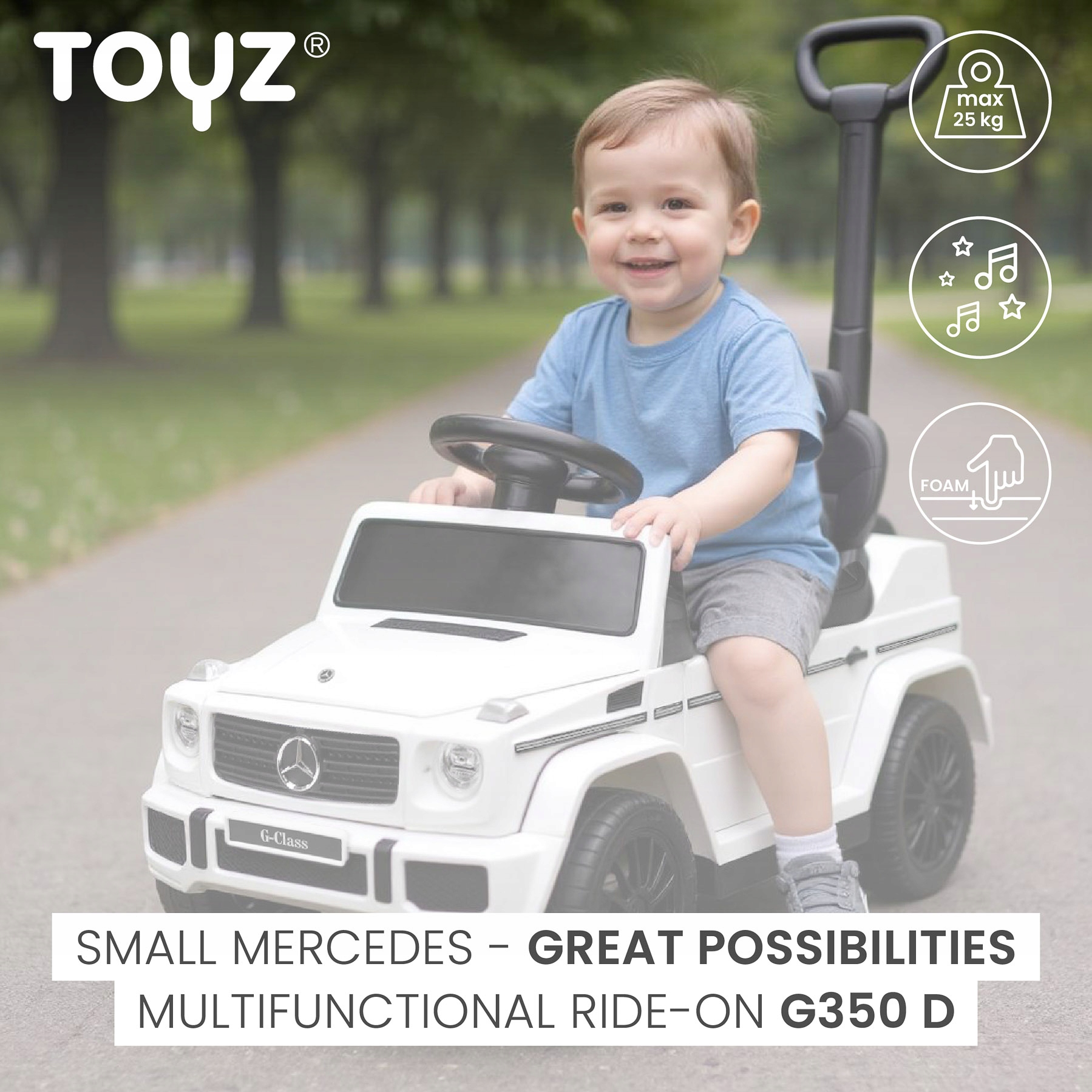 Ліцензований G350d — це більше, ніж просто поїздка. Це дизайнерський дитячий автомобіль, який відразу привертає увагу - завдяки точному відтворенню культового G-класу та елегантному виконанню. З одного боку, це іграшка, а з іншого – перша машина, якою можна справді похвалитися.
