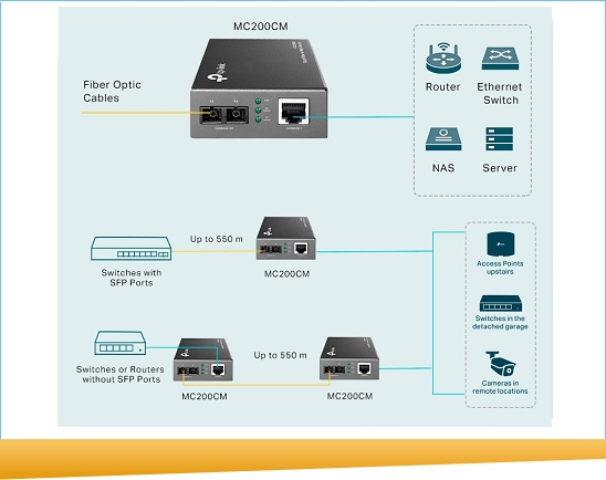 Конвертер може працювати як окремо стоячий пристрій або встановлюватися в 19-дюймову шафу TP-LINK. Порт TX має функцію автоматичного кросоверу (Auto MDI/MDI-X). На передній панелі розташовані світлодіодні індикатори, що інформують про робочий стан пристрою. Конвертер MC200CM використовує багатомодове оптичне волокно для передачі оптичного сигналу на відстань до 0,55 км.