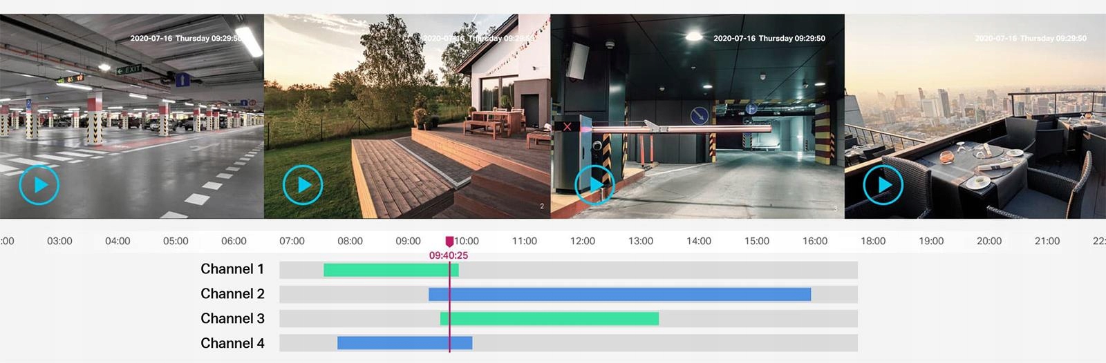 - Одночасне відтворення: пристрій дозволяє одночасно відтворювати записи з 4 камер †. Для того, щоб швидше переглядати матеріал, записи можна прискорити або шукати події у списку зі розкладу.