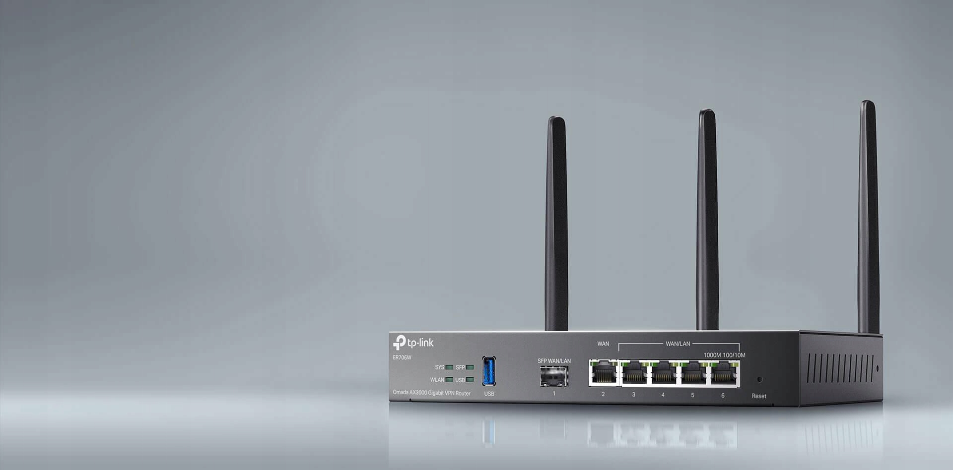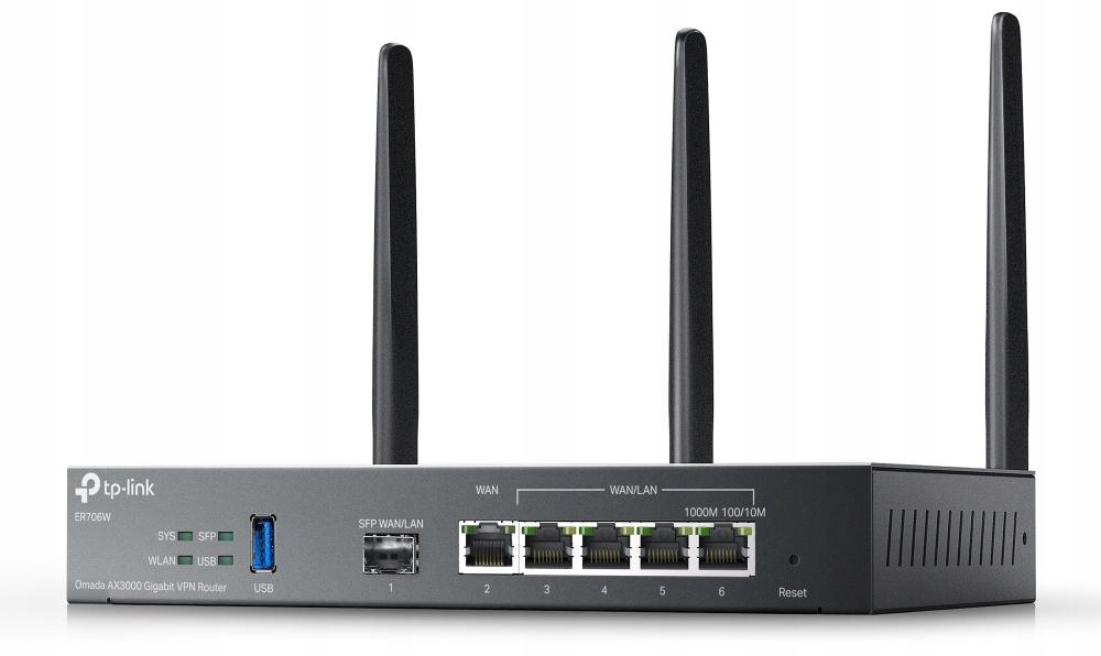 - VPN-маршрутизатор Omada TP-Link ER706W: 1× порт USB 3.0 для підключення модему 4G/3G для резервного з’єднання, 1× гігабітний порт SFP WAN/LAN, 1× гігабітний порт RJ45 WAN, 4× гігабітний порт RJ45 WAN/LAN b>