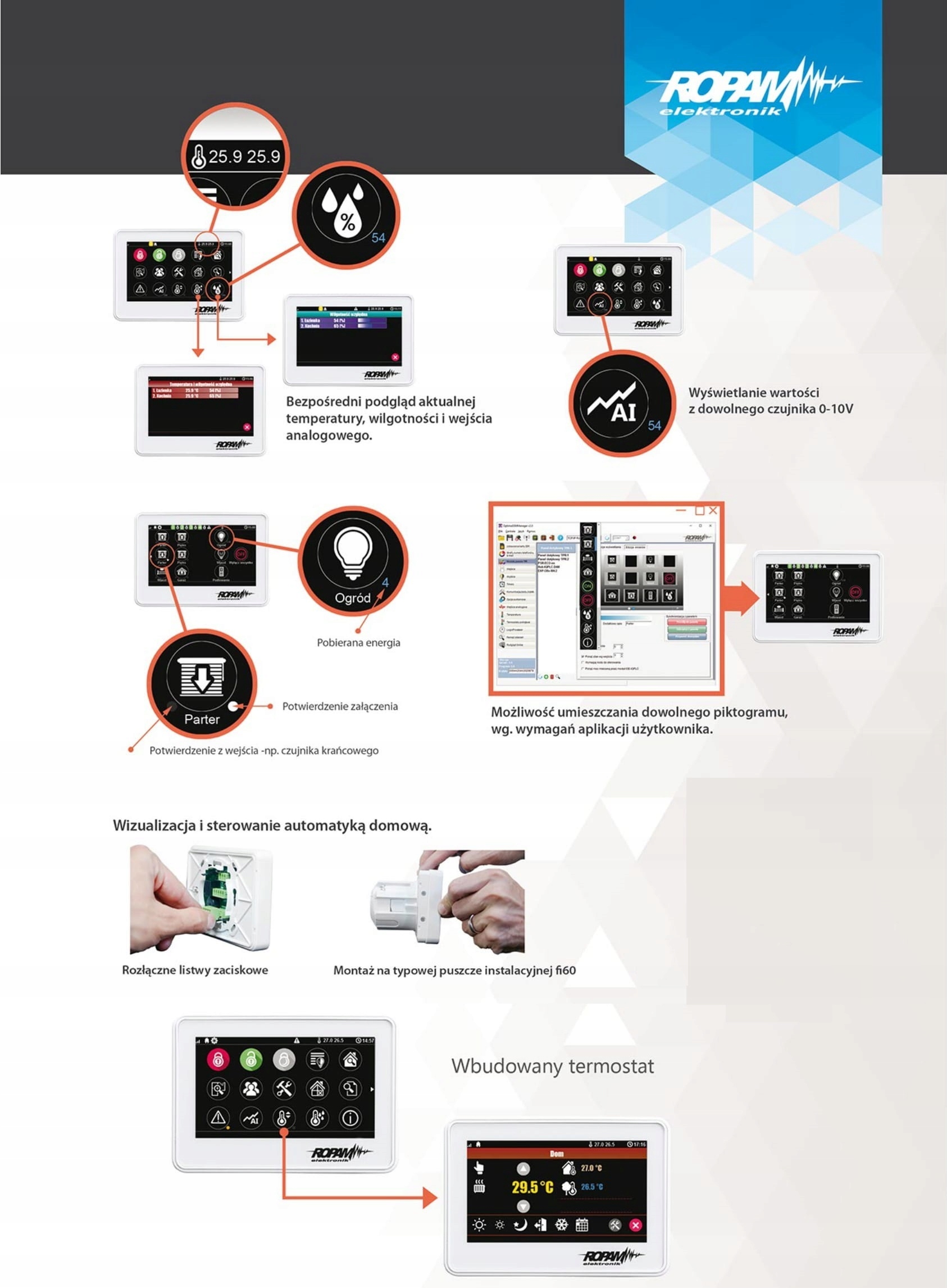 Панель TPR-4WS-P є великою перевагою функції термостата приміщення. Ця функція, заснована на встановленому часовому температурі, контролює кондиціонер та нагрівання, що дозволяє оптимальну температуру. Додатковою перевагою функції термостата є можливість зменшити витрати на опалення будинку. Система може бути запрограмована так, що під час відсутності домогосподарства опалення не працює і перемикається за годину до повернення додому.