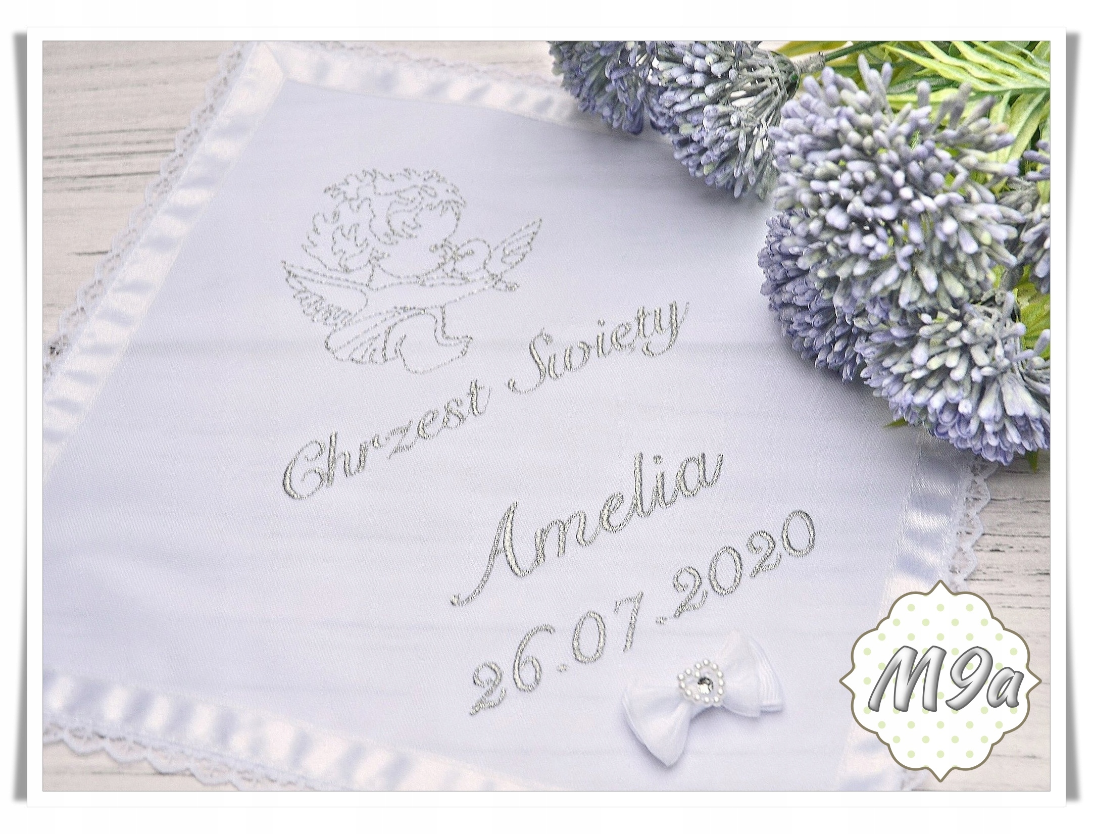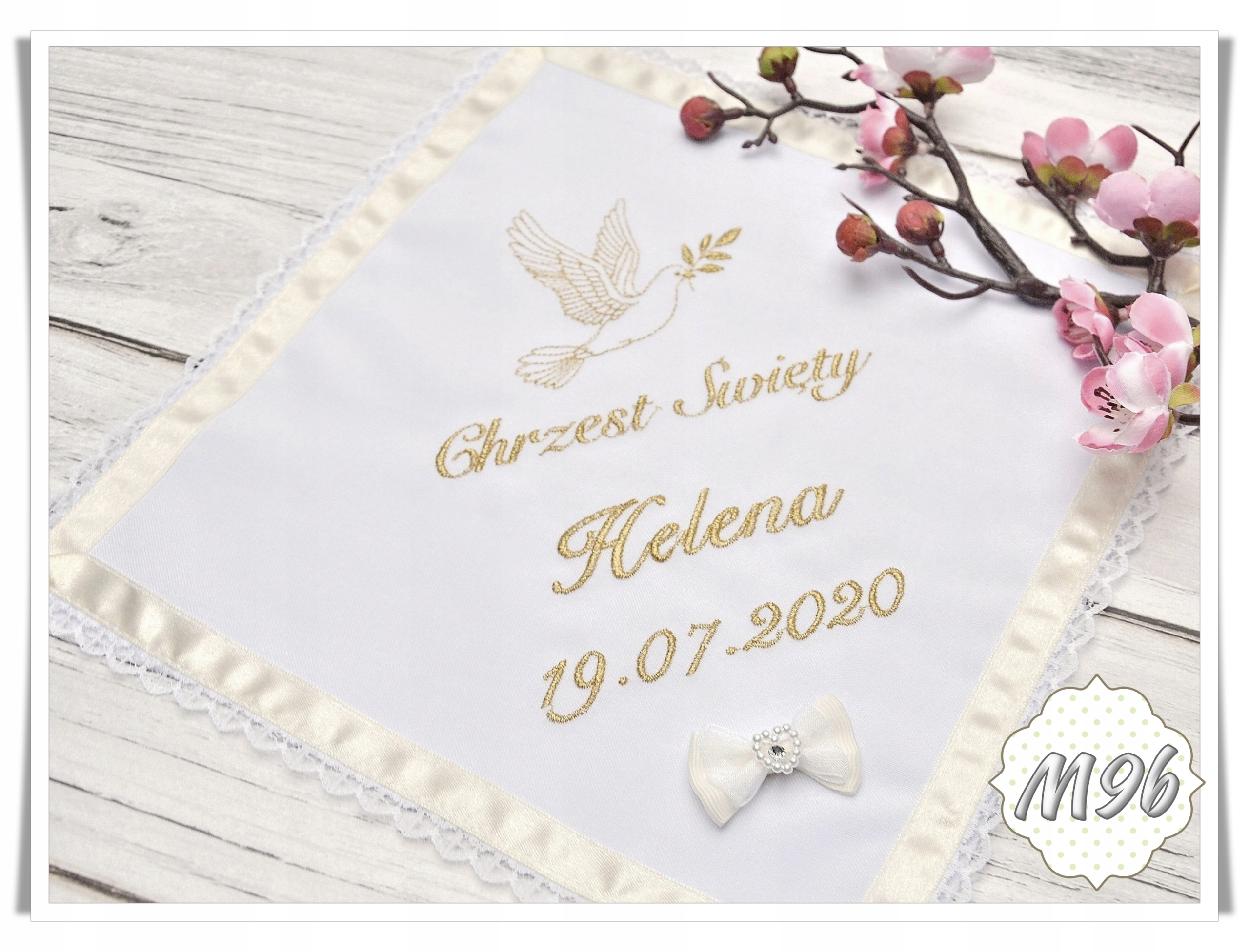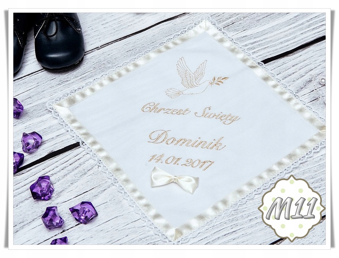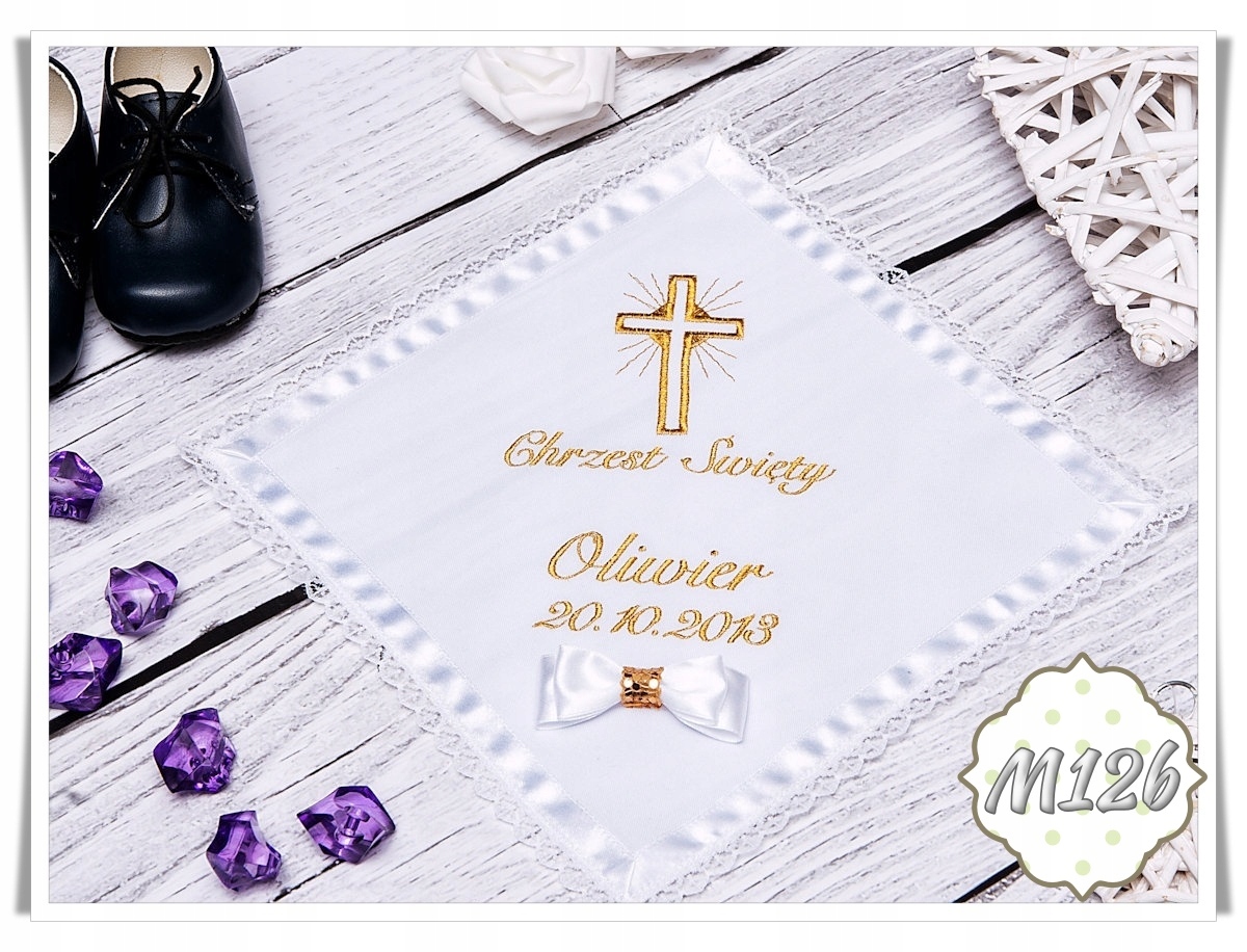 Наш шарф виготовлено з матеріалів найвищої якості, які гарантують його довговічність та елегантний зовнішній вигляд протягом багатьох років. Вишитий мотив на ризі показує символічні елементи, пов’язані з хрещенням, такі як янгол, голуб чи чаша.