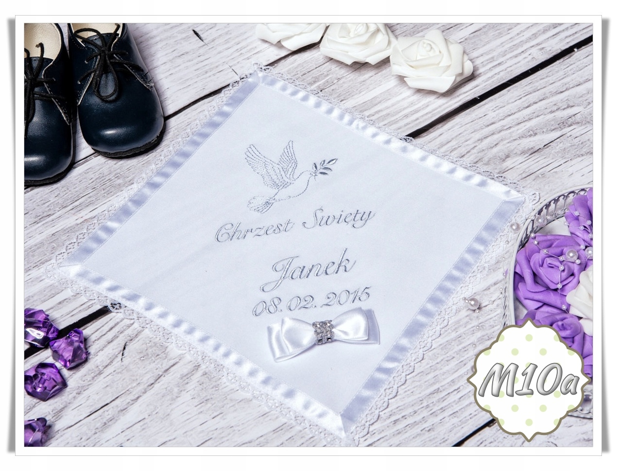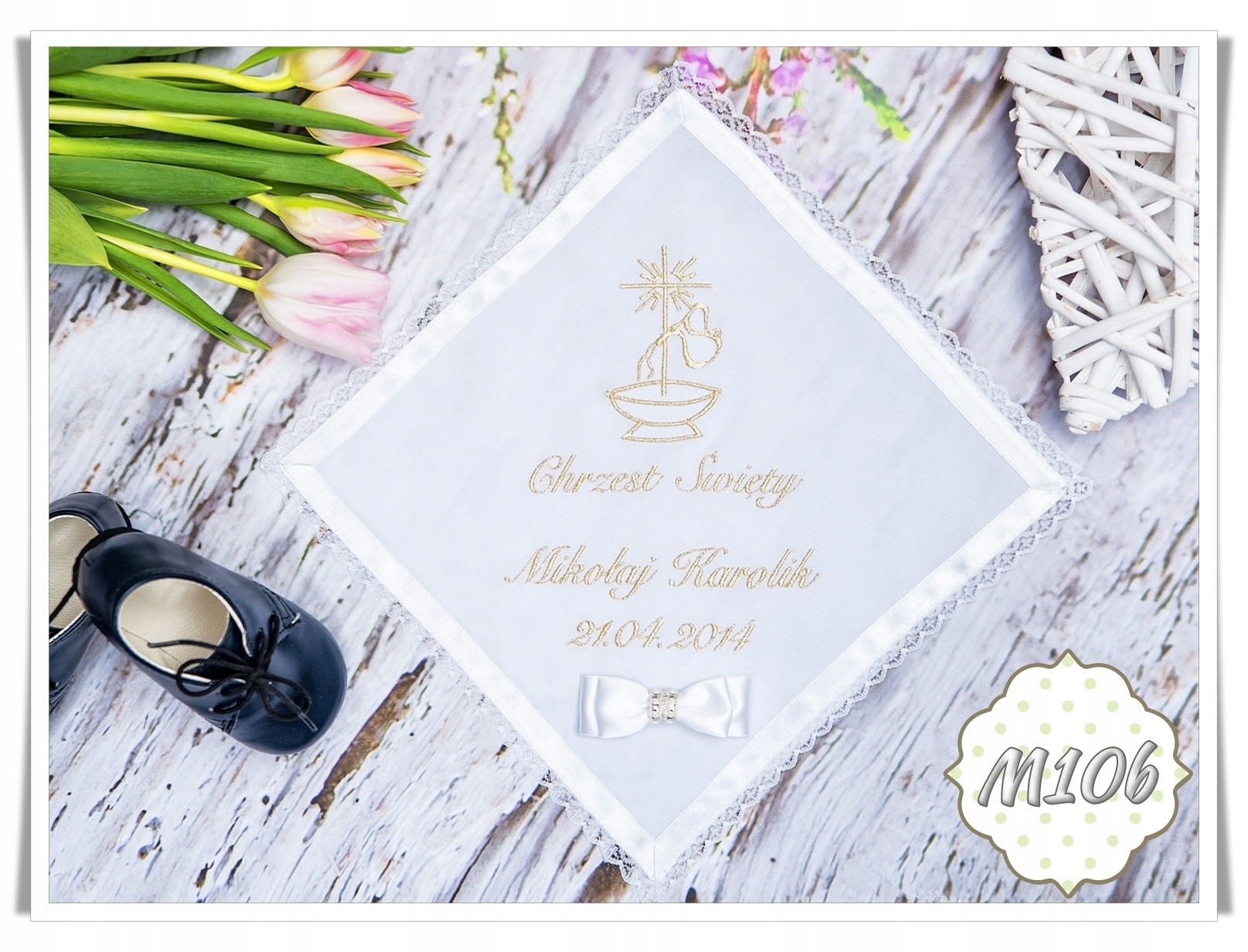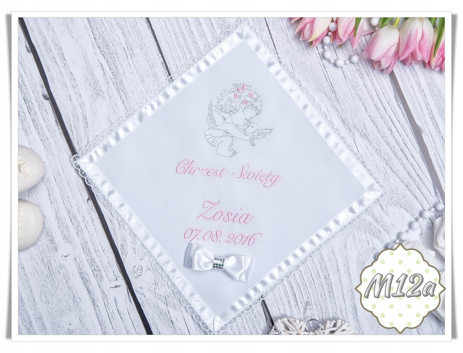 Наш шарф виготовлено з матеріалів найвищої якості, які гарантують його довговічність та елегантний зовнішній вигляд протягом багатьох років. Вишитий мотив на ризі показує символічні елементи, пов’язані з хрещенням, такі як янгол, голуб чи чаша.