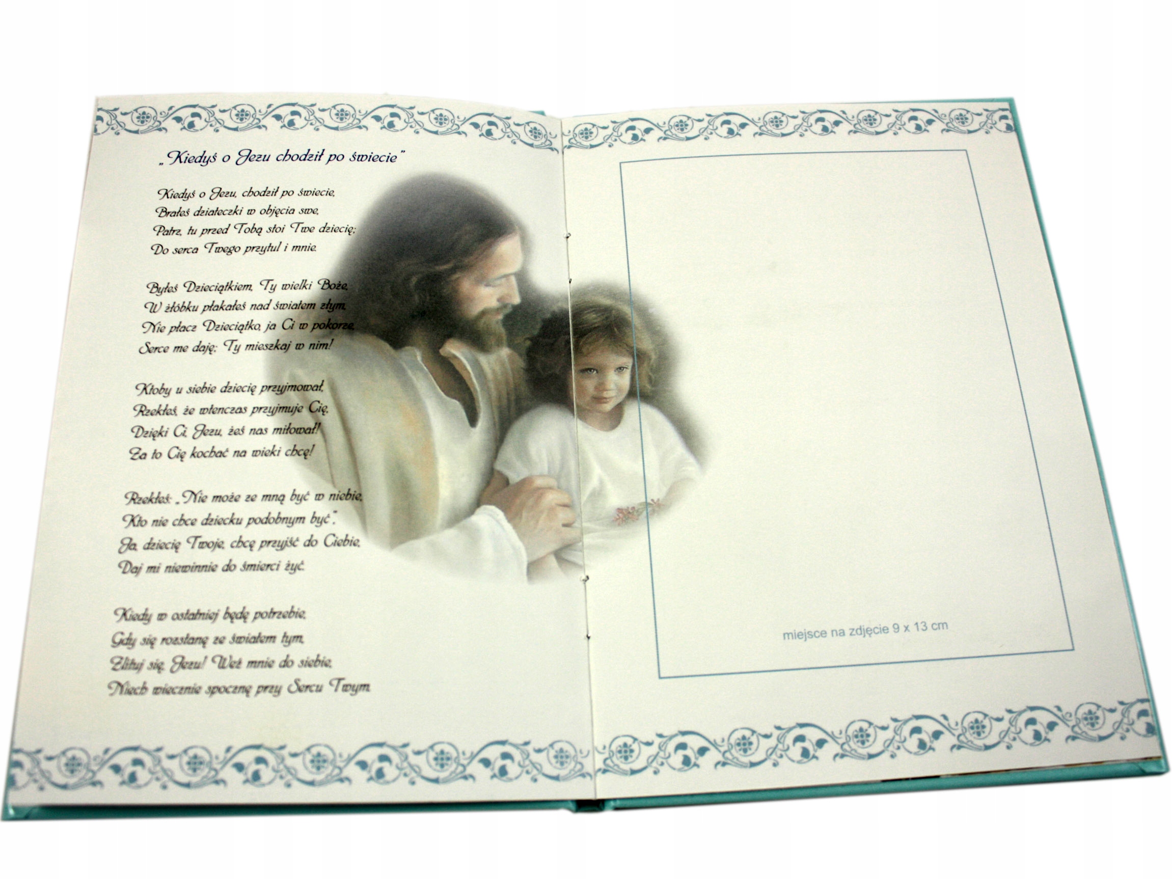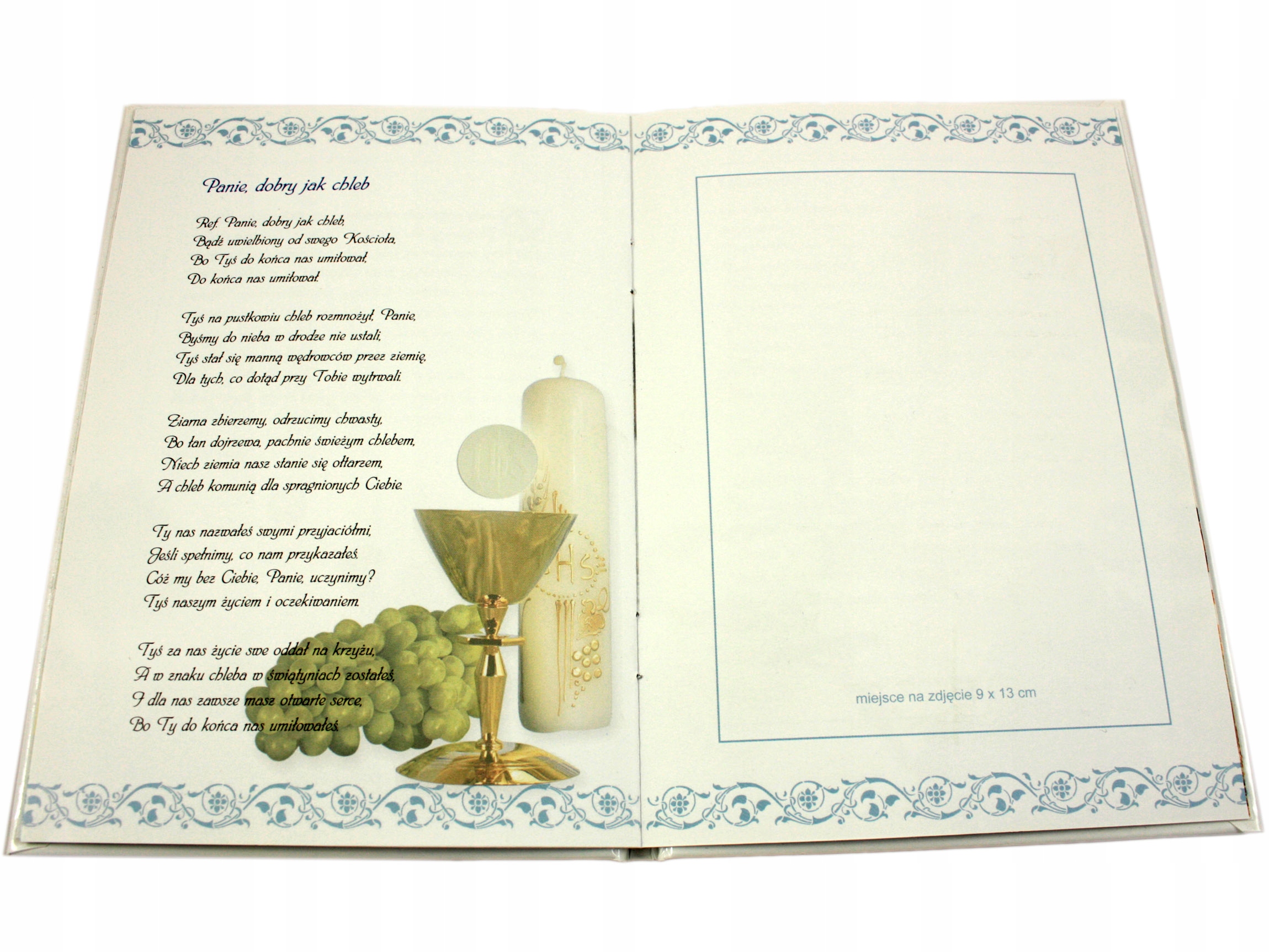 Кришка із зображенням Господа Ісуса Христа та чаші для причастя. Крім того, на обкладинці є золотий напис «Сувенір Першого Святого Причастя» та витончений золотий орнамент.