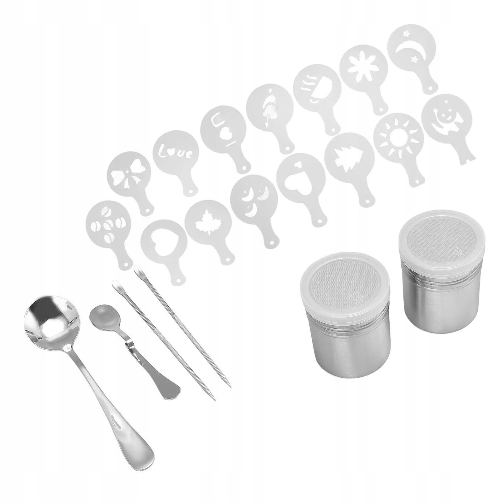 1. Набір трафаретів для кави: ви отримаєте 15 трафаретів для латте-арт, 2 ручки для латте-арт, 2 кавові ложки, 2 пудрениці, гарний набір для щоденного використання кави.