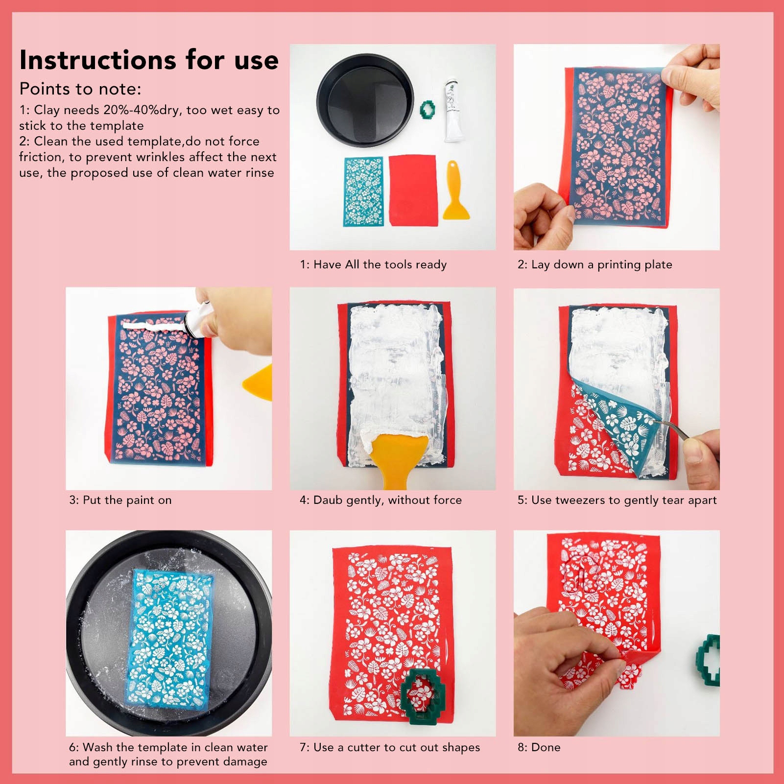 1, багаторазове використання: багаторазовий набір для трафаретного друку є багаторазовим і використовує акриловий матеріал на водній основі для малювання. Відразу після друку замочіть у воді на 5-10 хвилин, потім промийте водою, висушіть і відкладіть. 2, ЛЕГКИЙ У ВИКОРИСТОВУВАННІ: Трафарети для трафаретного друку прості у використанні, просто помістіть їх на місце, яке ви хочете зробити своїми руками, потім пофарбуйте їх і перетягніть ракелем, зачекайте кілька хвилин, і, нарешті, ви можете робити будь-які види саморобних робіт. 3. ТРЕНУВАЙТЕ СВОЇ НАВИЧКИ: набір для трафаретного друку з полімерної глини може вправляти ваші руки, насолоджуватися дозвіллям під час саморобки та розвивати вашу уяву та креативність, даруючи вам відчуття досягнення. 4, ПОЛІЕСТРОВИЙ МАТЕРІАЛ: Трафарети для трафаретного друку з полімерної глини виготовлені з поліестеру, їх нелегко деформувати або зламати, мають вишукану майстерність, слизьку поверхню та можуть служити вам протягом тривалого часу. 5、Ідеальний подарунок: трафарети для трафаретного друку — це весело та ідеально підходить як подарунок для ваших друзів, сім’ї, колег і сусідів, які люблять DIY, щоб показати їм, що ви дбаєте про них, і зміцнити ваші стосунки.