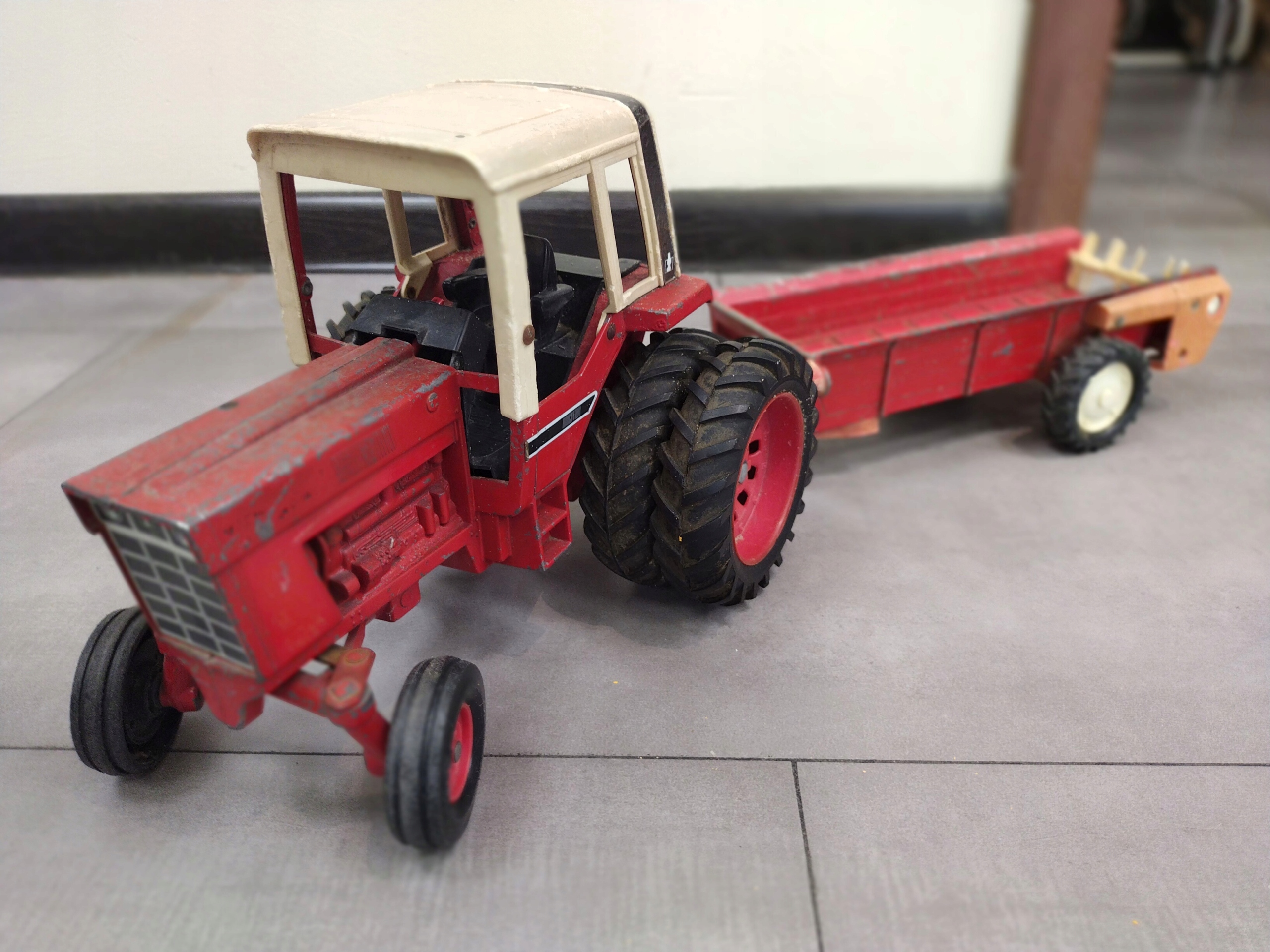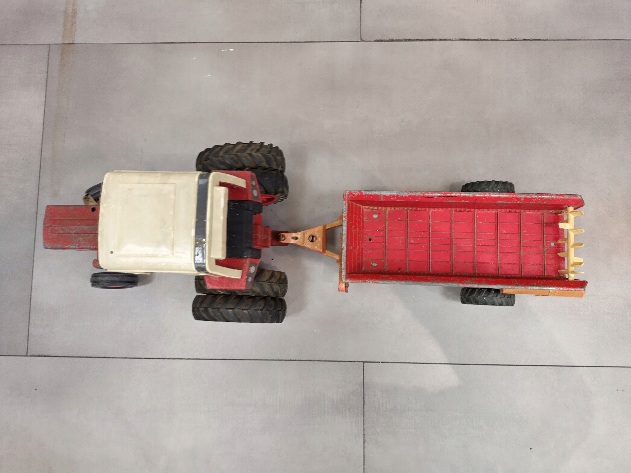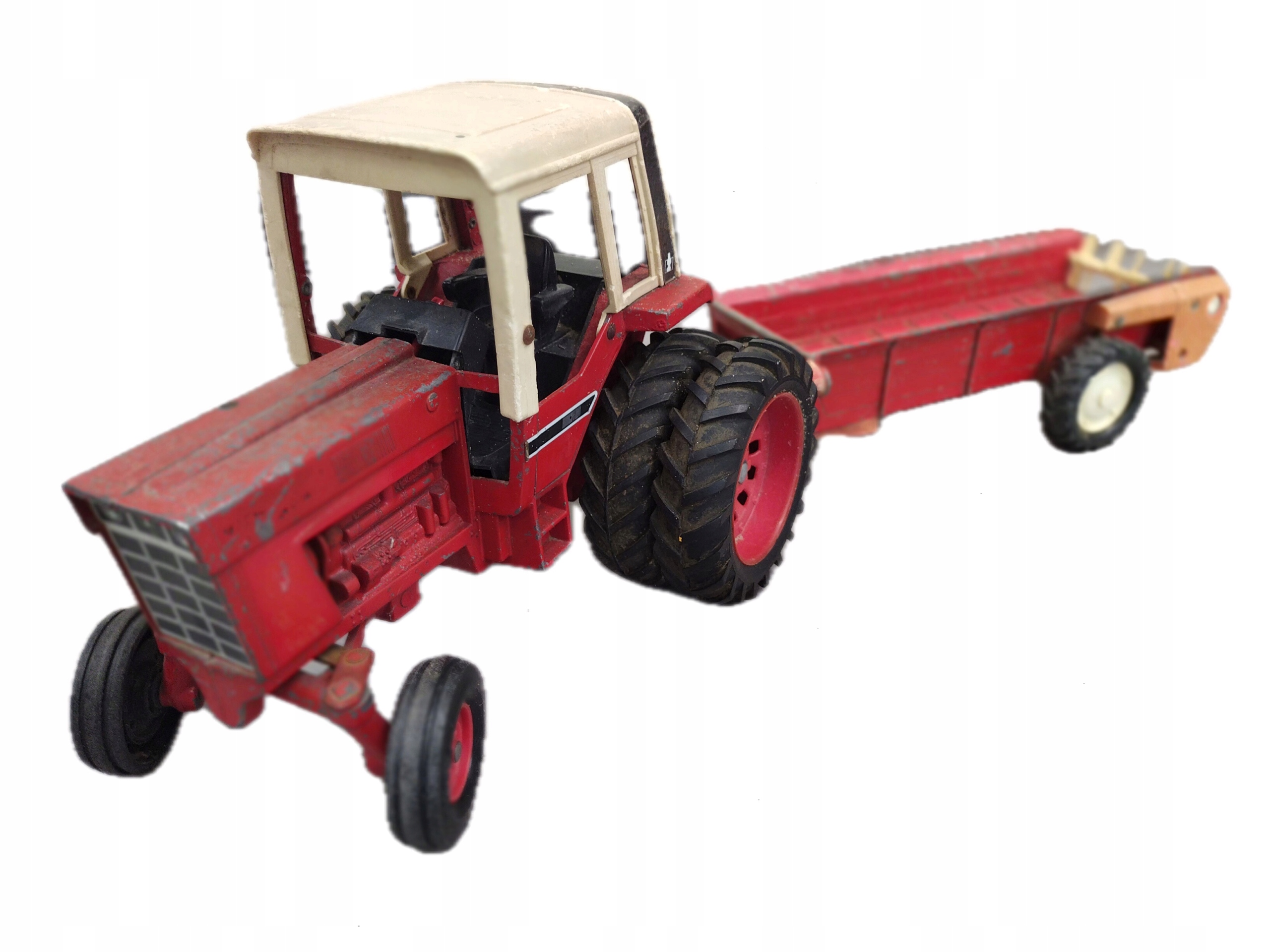 Представлена весна - це трактор в інтенсивному червоному кольорі з білим дахом, який привертає увагу його класичним зовнішнім виглядом. Зроблена з металу та пластику, модель має відкривачі двері, що дає їй реалізм. Трейлер, який є частиною набору, робить цю весну ще більш привабливою для колекціонерів. Видимі ознаки використання, такі як подряпини та осколки, надають йому характер і в той же час свідчать про свою історію. Це ідеальне доповнення до будь -якої колекції, особливо для любителів сільськогосподарської техніки.