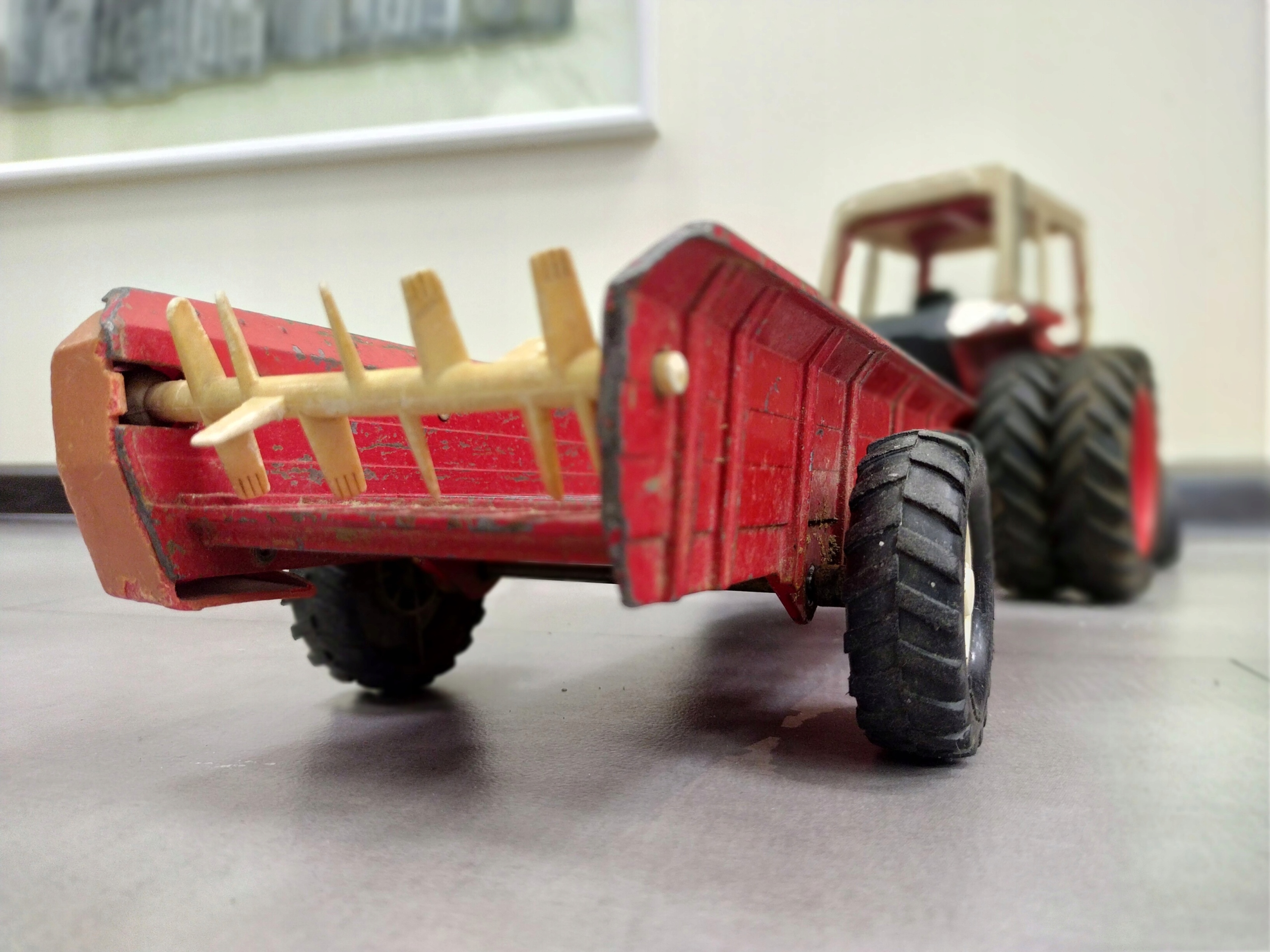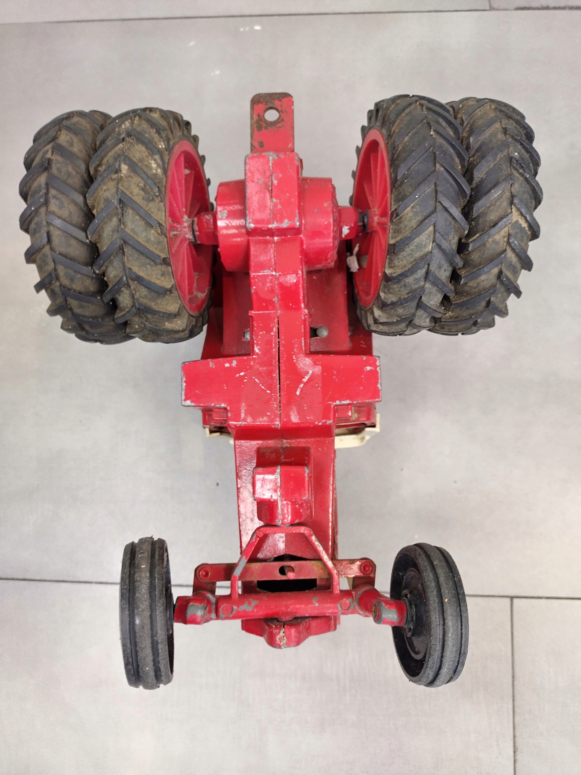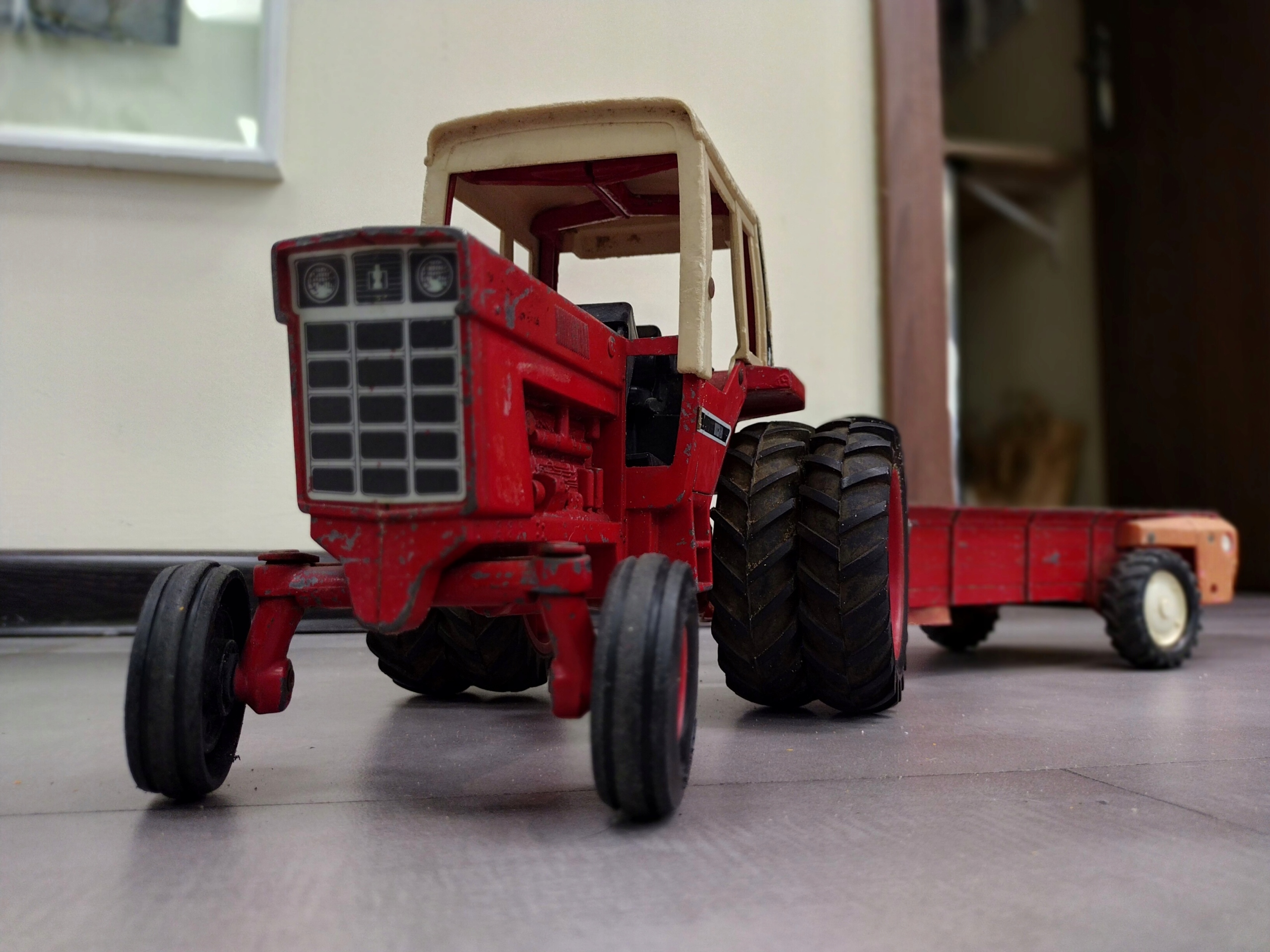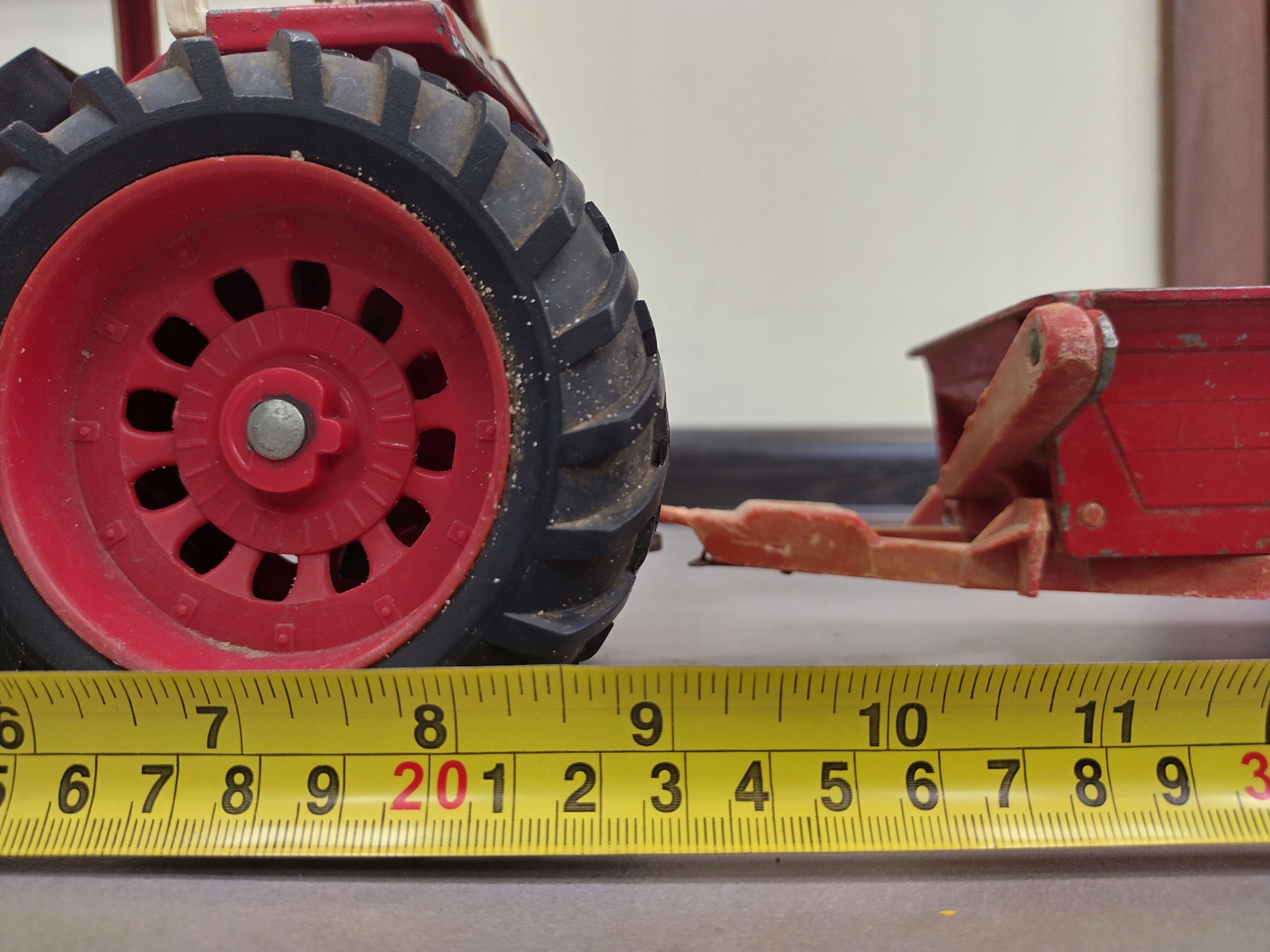 Представлена весна - це трактор в інтенсивному червоному кольорі з білим дахом, який привертає увагу його класичним зовнішнім виглядом. Зроблена з металу та пластику, модель має відкривачі двері, що дає їй реалізм. Трейлер, який є частиною набору, робить цю весну ще більш привабливою для колекціонерів. Видимі ознаки використання, такі як подряпини та осколки, надають йому характер і в той же час свідчать про свою історію. Це ідеальне доповнення до будь -якої колекції, особливо для любителів сільськогосподарської техніки.
