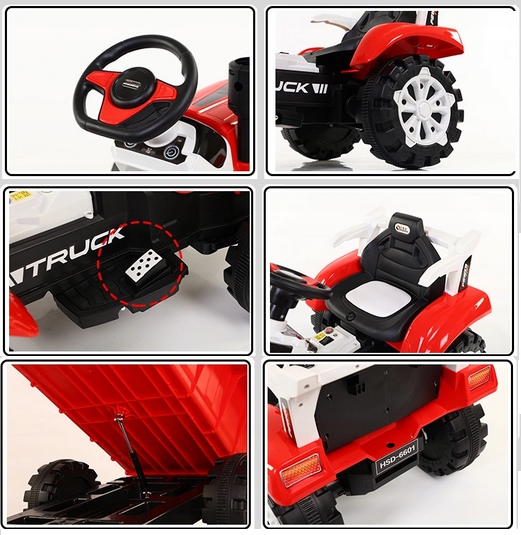 Трактор на акумуляторі. Він працює від двох потужних електродвигунів, що живляться від акумулятора 6V7Ah. Автомобіль оснащено звуковими ефектами, що активуються кнопками, USB-портом для флешки, регулятором гучності та світлодіодним освітленням. Є 3 швидкості руху вперед і назад. Уроки безпечного водіння забезпечуються найновішим дистанційним керуванням 2.4G, що дає батькам повний контроль над автомобілем. Знімний причіп.