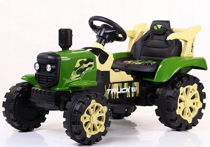 Трактор на акумуляторі. Він працює від двох потужних електродвигунів, що живляться від акумулятора 6V7Ah. Автомобіль оснащено звуковими ефектами, що активуються кнопками, USB-портом для флешки, регулятором гучності та світлодіодним освітленням. Доступні 3 швидкості руху вперед. Уроки безпечного водіння забезпечуються найновішим дистанційним керуванням 2.4G, що дає батькам повний контроль над автомобілем. Знімний причіп.