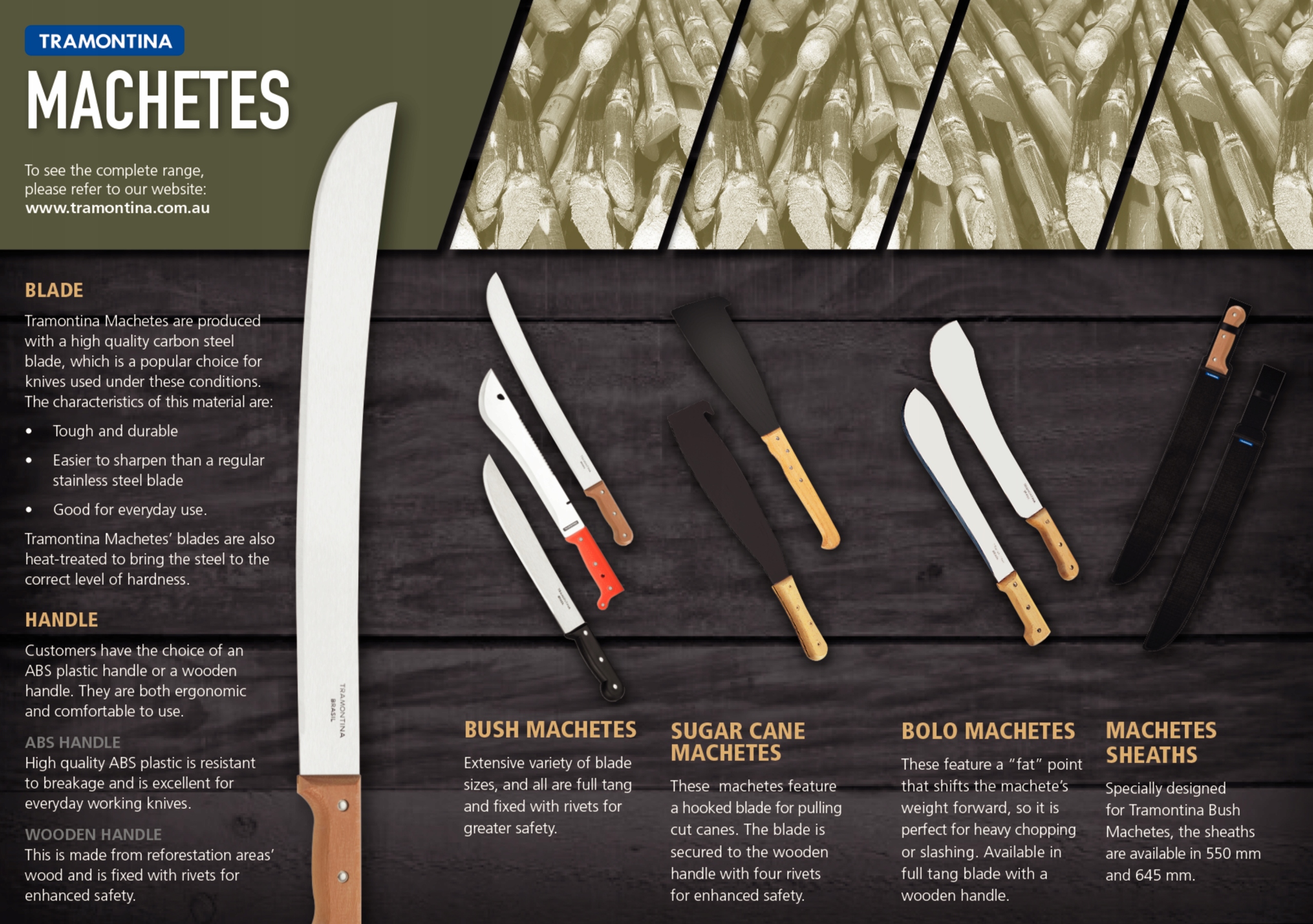 Tramontina b> виробляє високоякісні мачете, від мачете Bush і Bolo до мачете, призначеного для цукрової тростини. Мачете Tramontina є одним із найбільш часто використовуваних сільськогосподарських знарядь у Південній Америці та на островах Тихого океану.