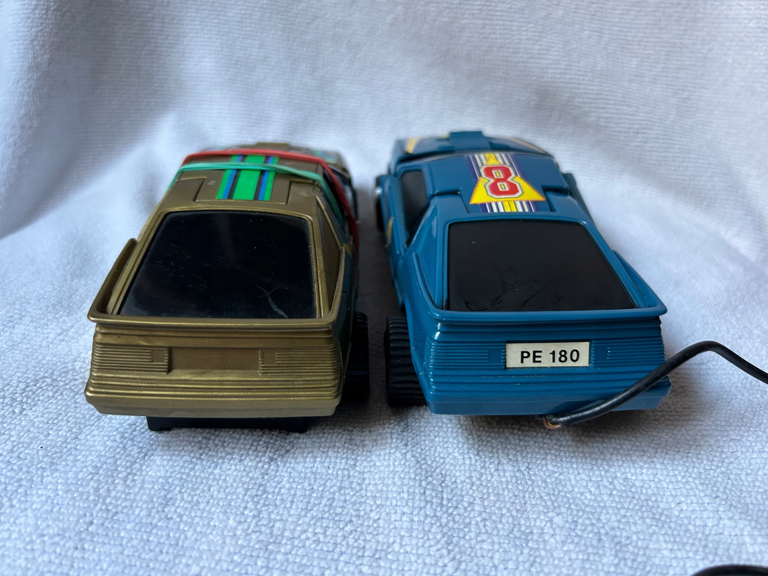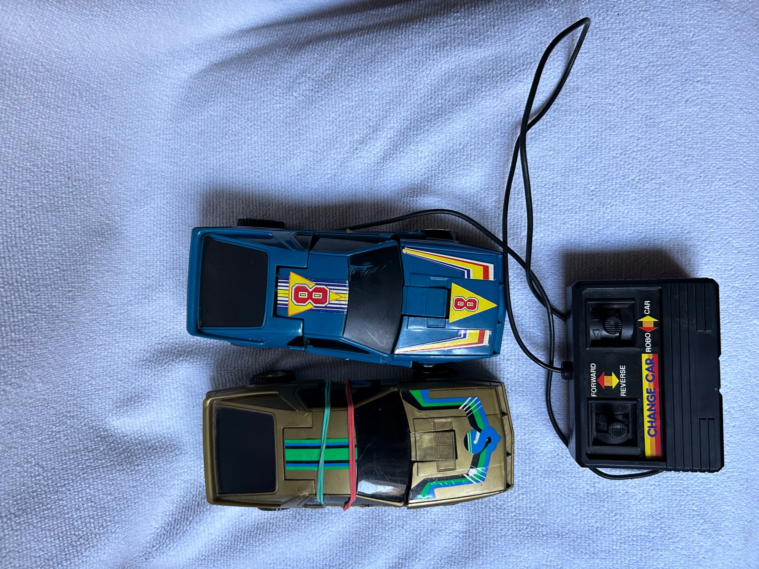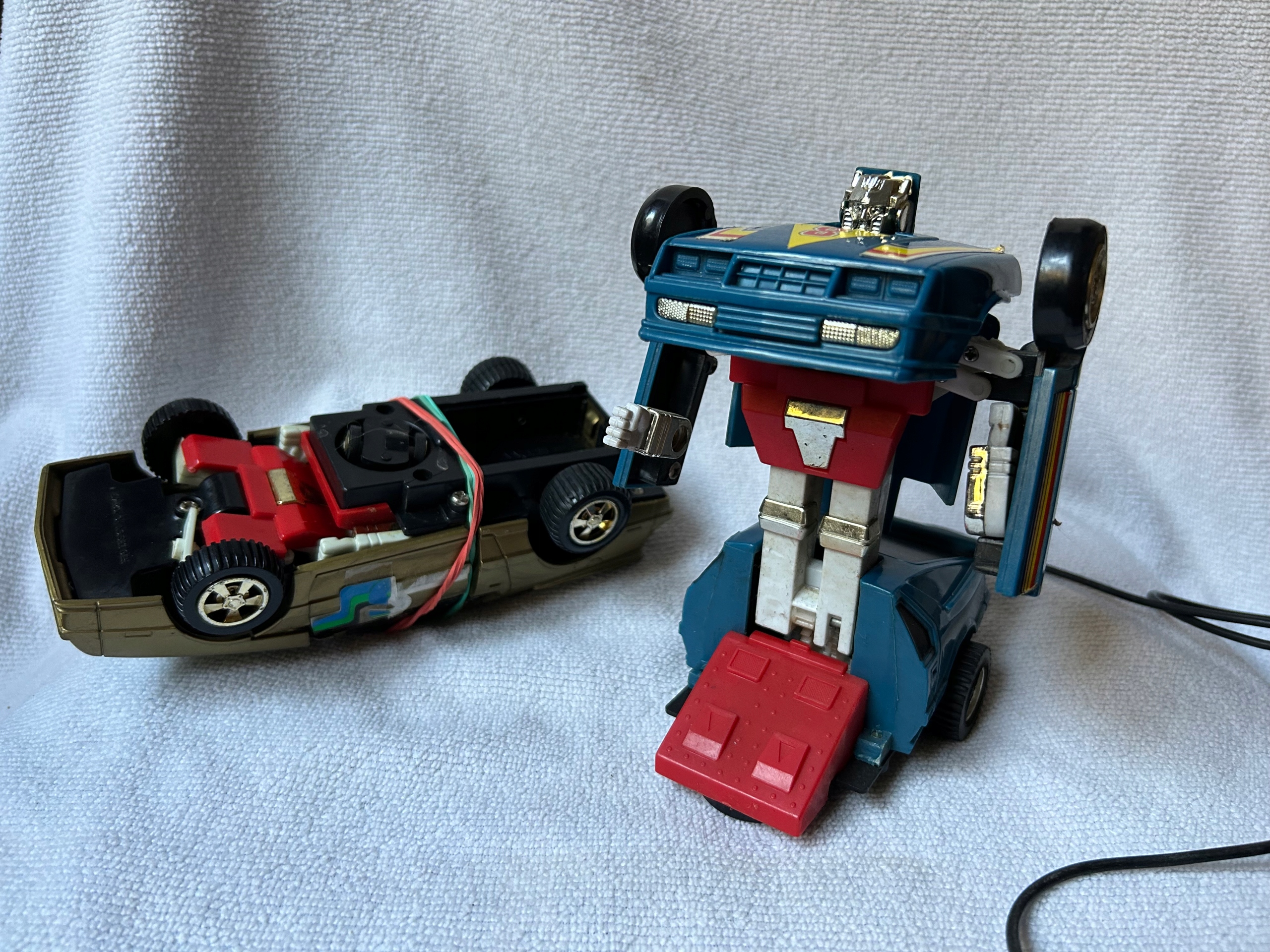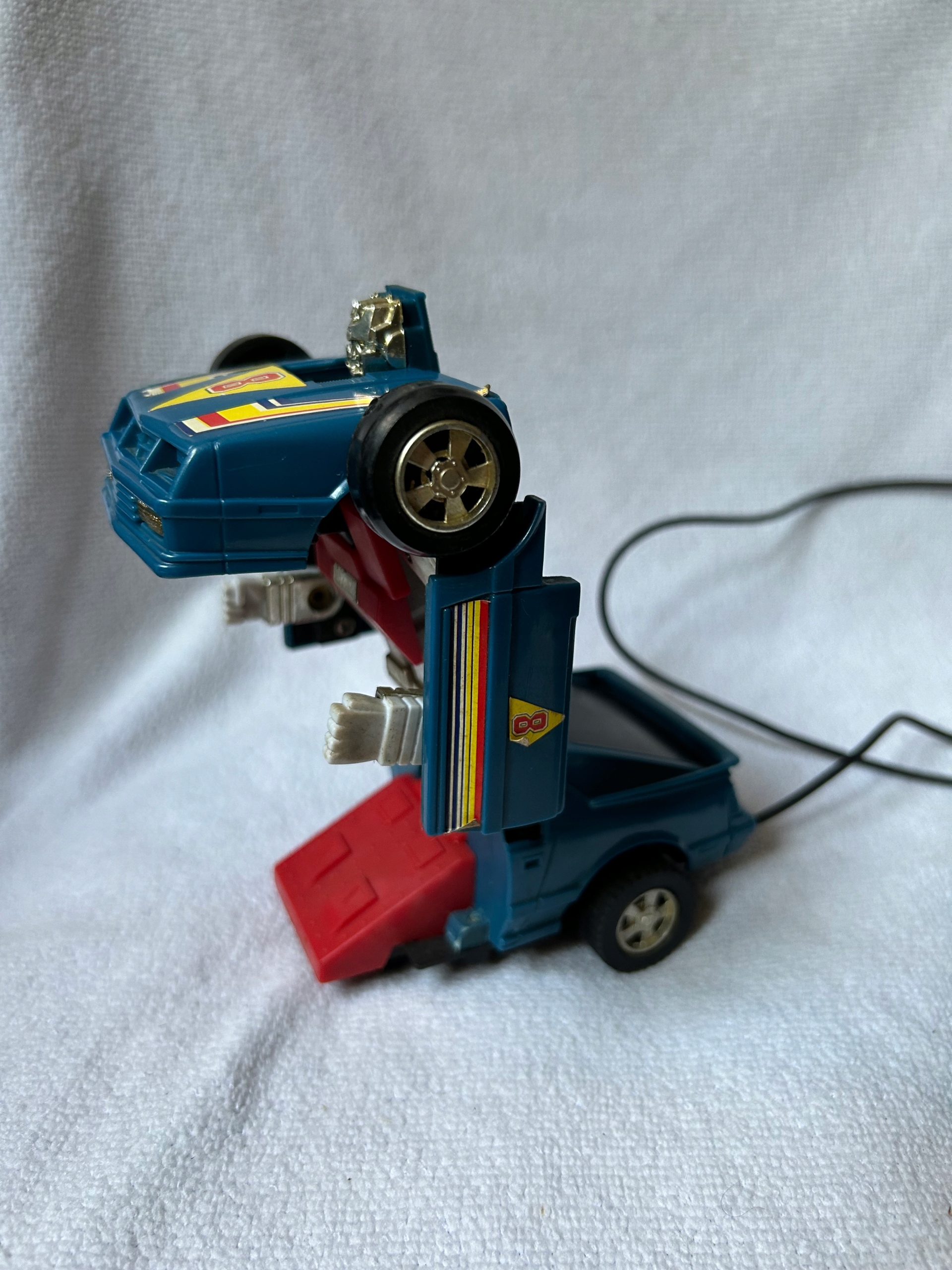 Трансформери 1980-х років, золотий автомобіль, їздить і змінює напрямок під час зіткнення з перешкодою (типова екшен-іграшка Bump and Go – механізм працює, але модель потребує ремонту)