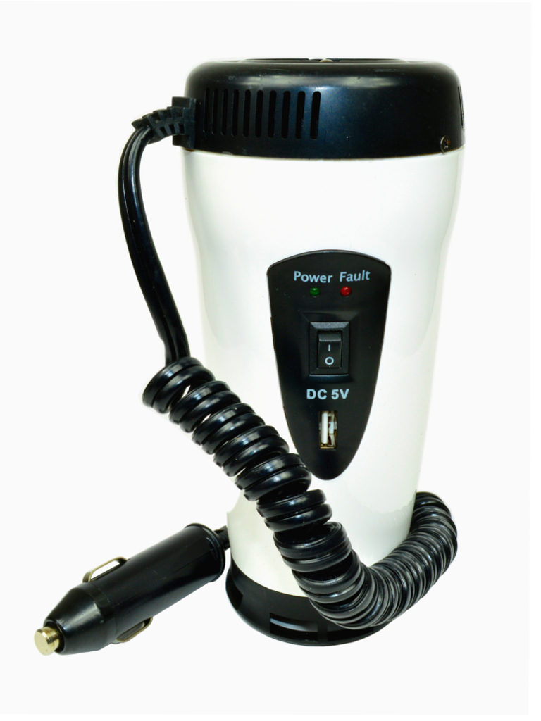 - Живлення перетворювача здійснюється від гнізда прикурювача автомобіля. Виготовлений у формі банки, він ідеально підходить для тримачів для напоїв.
